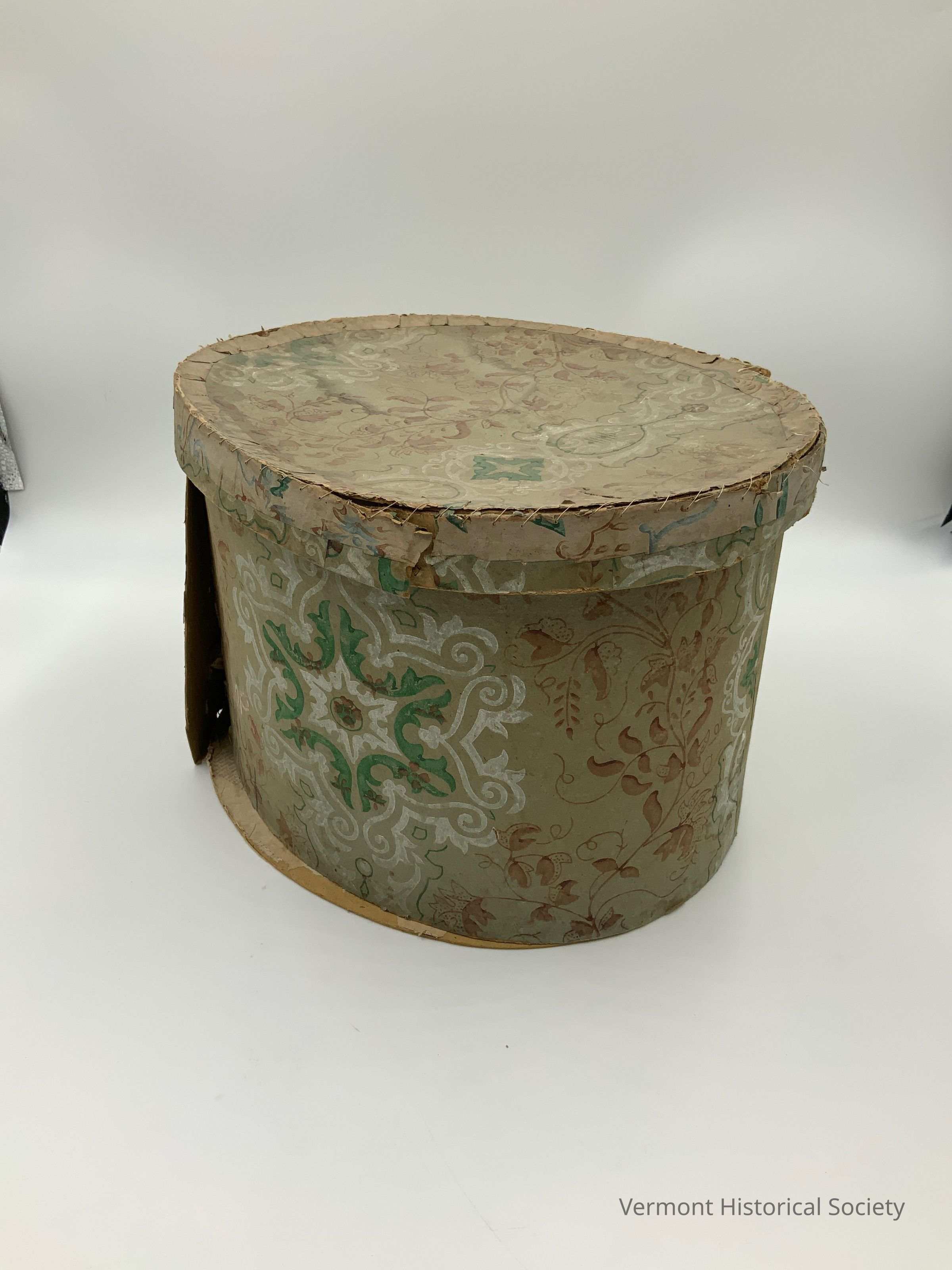 This bandbox, or hatbox, is covered in wallpaper featuring a block printed design of white-and-green snowflakes alternating with brown vines. It is comprised of both a box and a lid. The interior of the box is lined with newspapers from Concord, New Hampshire.