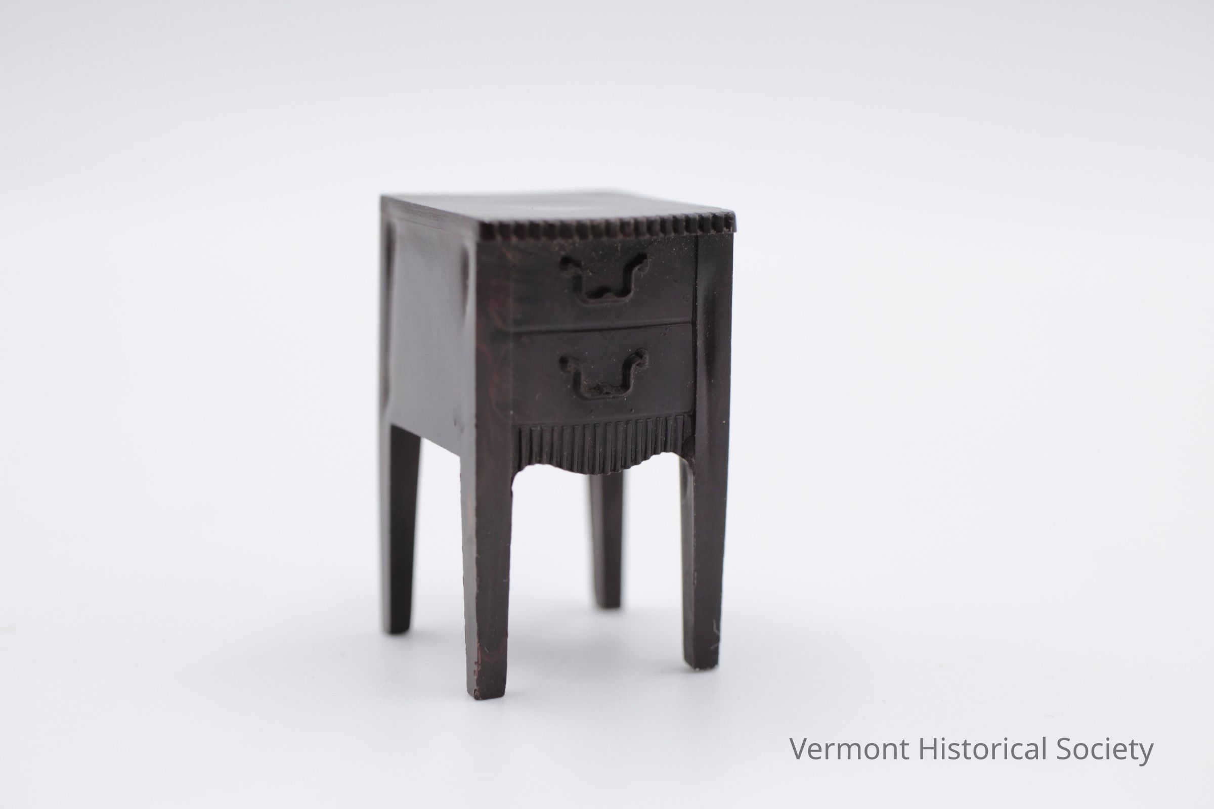 Miniature plastic nightstand sized for a dollhouse. The stand has four legs, and the front is molded with two drawer fronts, each with hanging pulls.Context