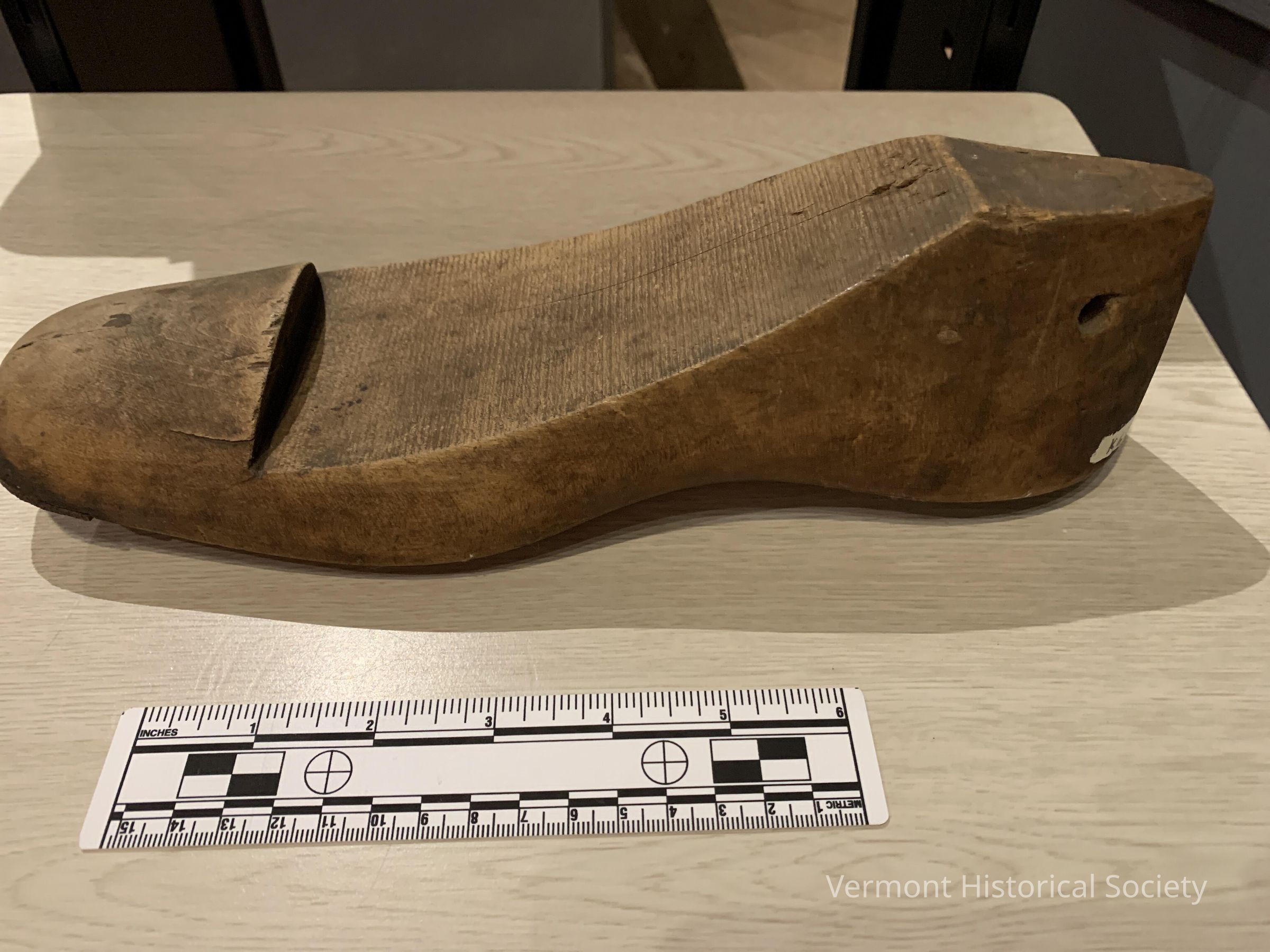 Wooden shoe last. The upper portion of the foot is cut away. There is a hole through the upper heel for hanging.