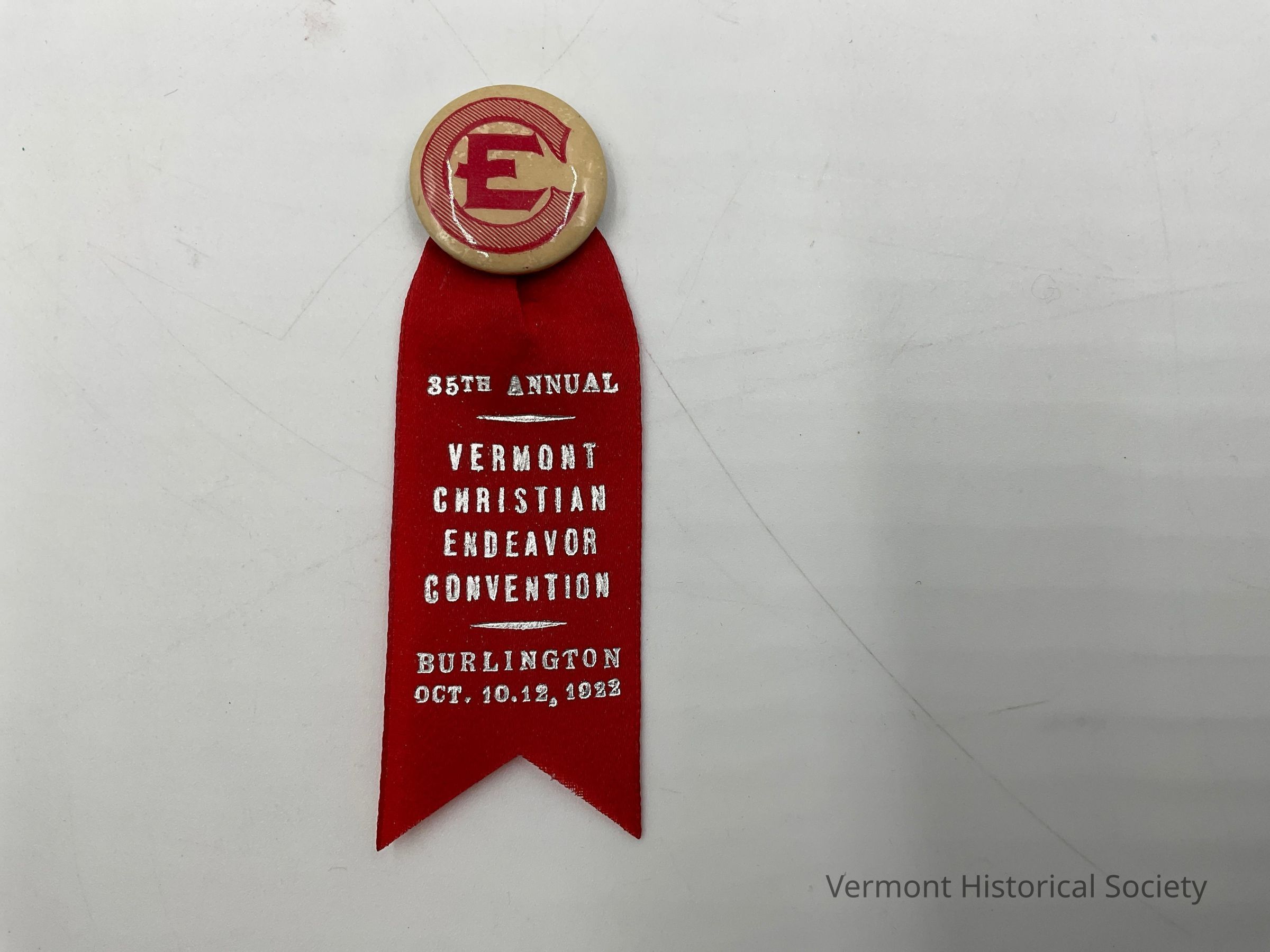 White button with the logo for the Society of Christian Endeavor -- an E within a C -- printed in red and an attached red ribbon. Printed in silver on the ribbon is: "35th annual Vermont Christian Endeavor Convention, Burlington, Oct. 10-12, 1922.Context