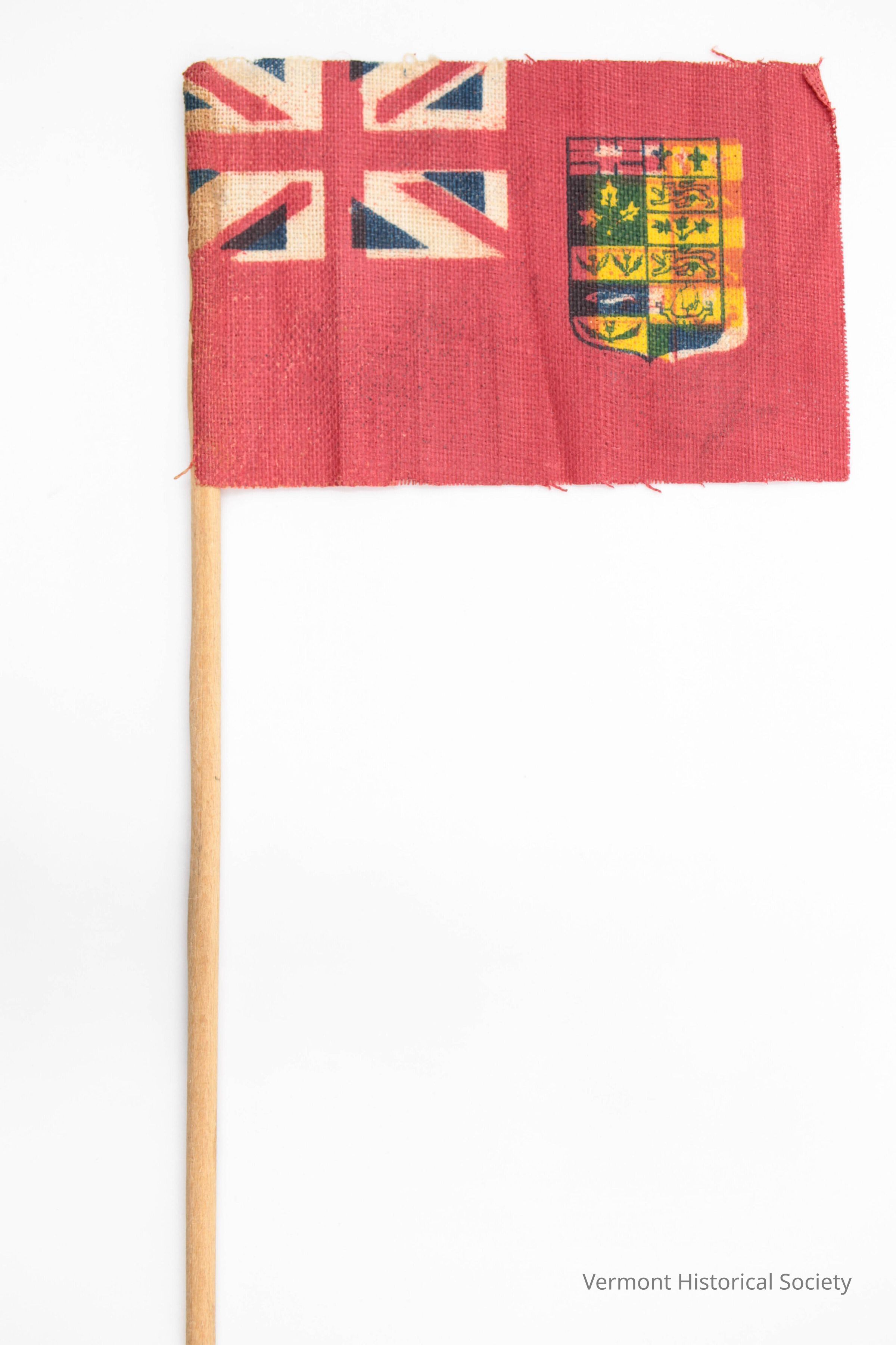 Small Canadian "Red Ensign" flag printed on cotton. The flag is glued to a small wooden dowel.