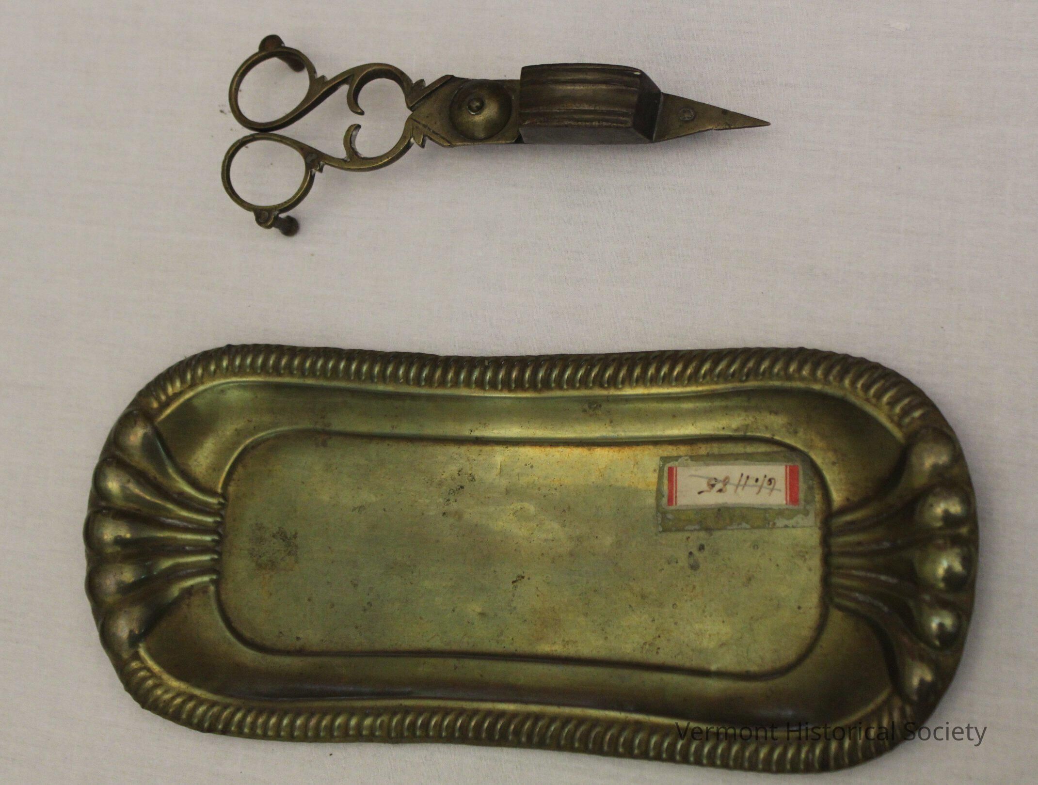 Candlesnuffer and tray. The tray is made of 28-gauge sheet brass. It features a rope design that was likely created by pressing or embossing the metal. The snuffer is made of cast brass and has decorative handles that are finely finished. The snuffer has three trivet legs and some traces of brass polish are visible in certain crevices of the metal.