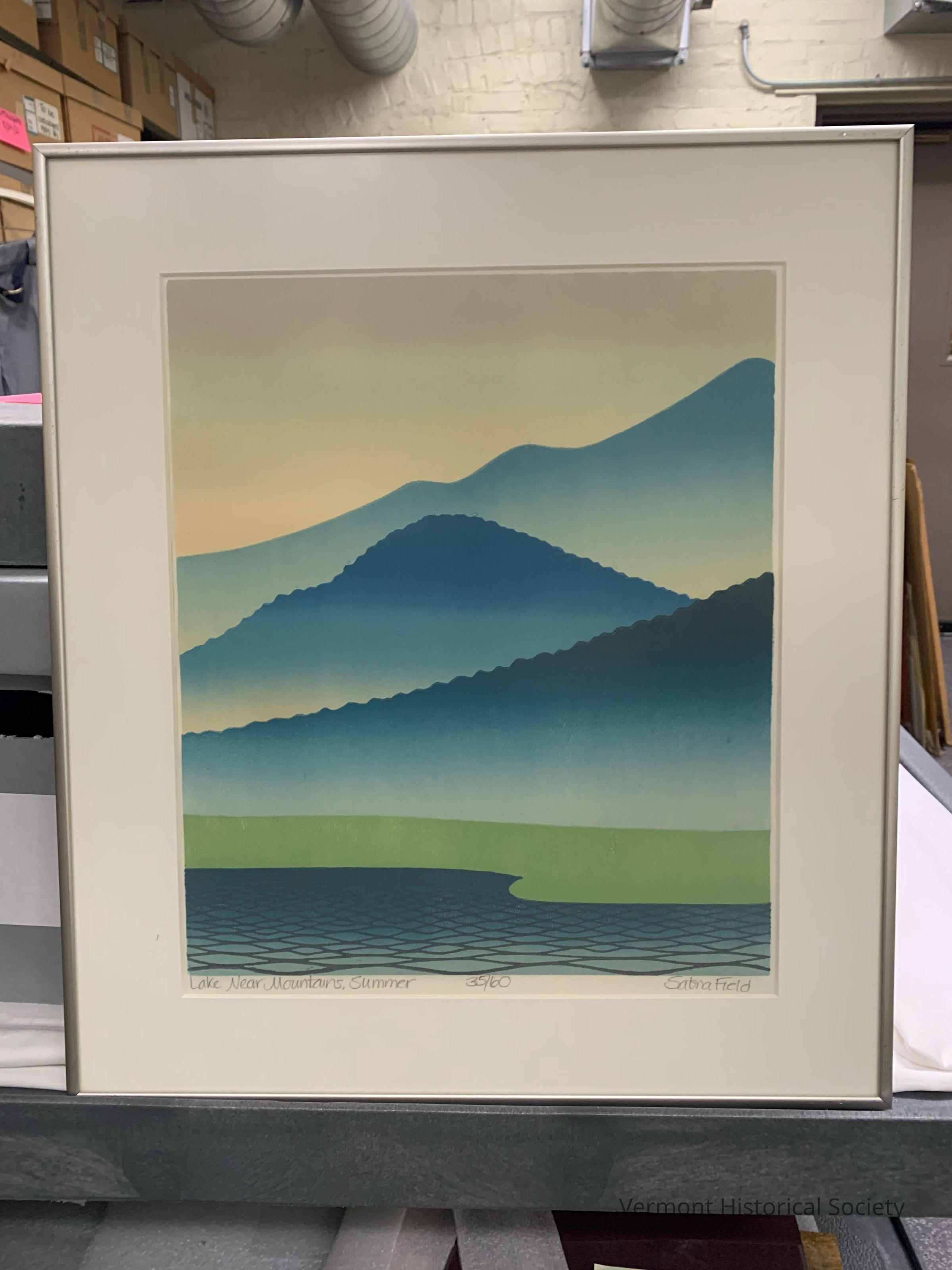 Sabra Field was born in Oklahoma, grew up in New York, and attended Middlebury College, graduating in 1957. Influenced by her art teachers Joseph Ablow and Arthur K. D. Healy, she resolved to become an artist. After further study at Wesleyan College, where she made her first woodcut prints, she taught art at various prep schools in Connecticut. Although married and the mother of two young sons, she was committed to pursuing her career as an artist. In 1965 she acquired a derelict 19th-century tavern “waiting to fall down” in the White River Valley, which she eventually restored and converted to a permanent home and studio.