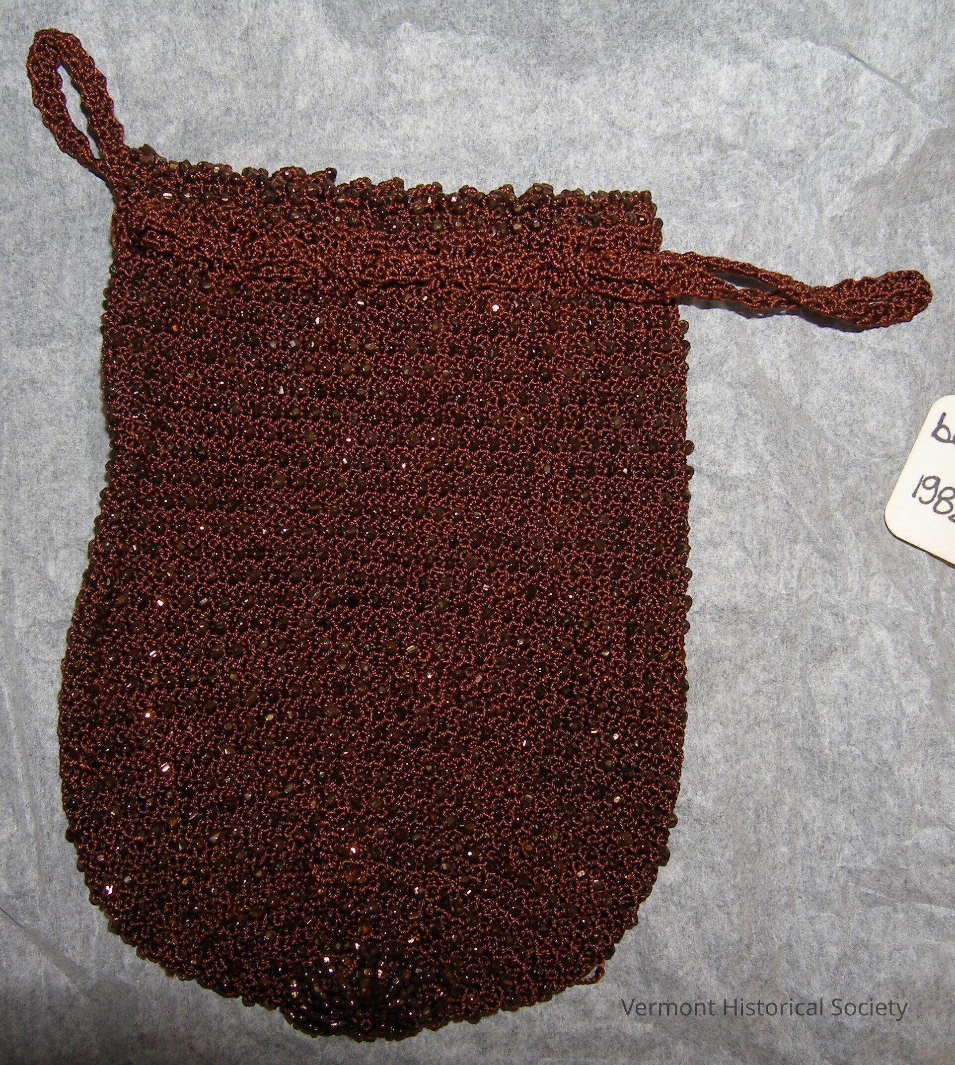 Small, brown crocheted and beaded purse. The top closes with a crocheted drawstring loop.