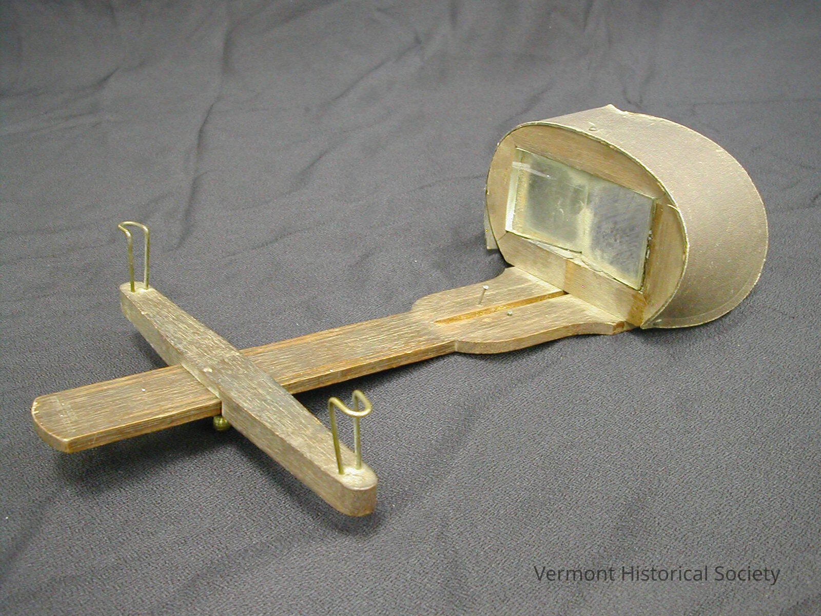 Stereoscope with stand. The stereoscope consists of a brass-covered oval section with glass lenses and an adjustable base for holding stereo view cards. The stand consists of a round base with a decoratively turned shaft and a round brass joint that allows the angle of the scope to be manipulated.
