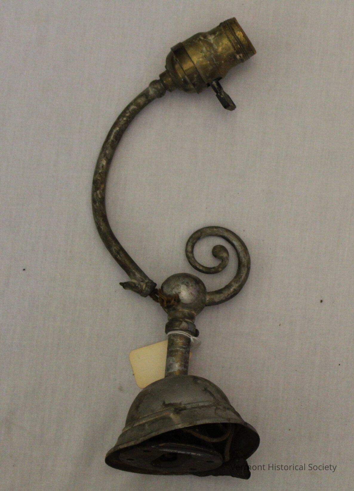 Metal electric light fixture. The fixture is made of brass. There is a cast iron base that screws to the wall for support. A bell-shaped cover of brass hides the casting. The single socket has the imprint of a keystone on its switch-key.