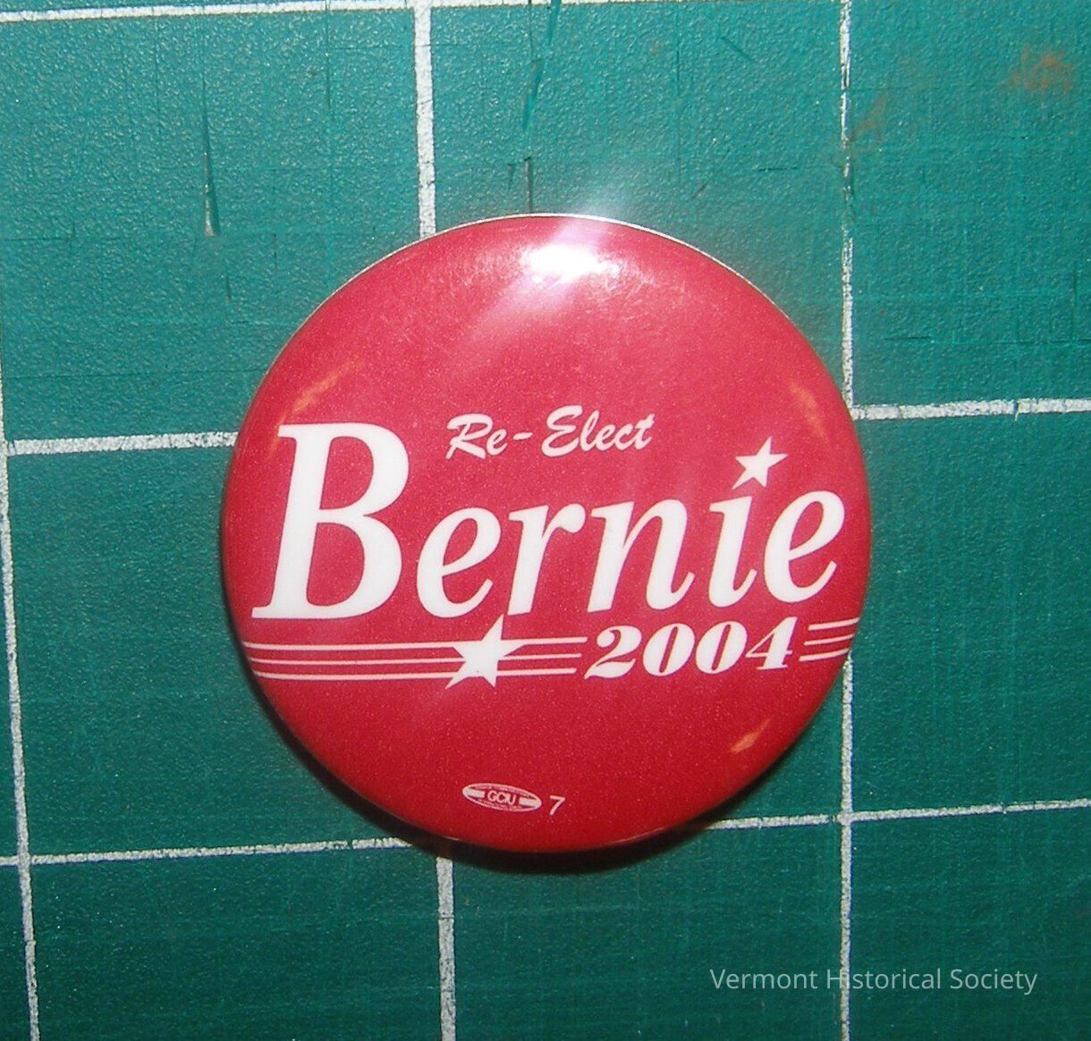 Red button with the white inscription, "Re-Elect Bernie 2004". Three lines go across the middle of the button, flanking the year. The "i" is dotted with a star, and there is a second star on the three-line stripe. There is a small oval maker's mark and the number 7 at the bottom of the button.