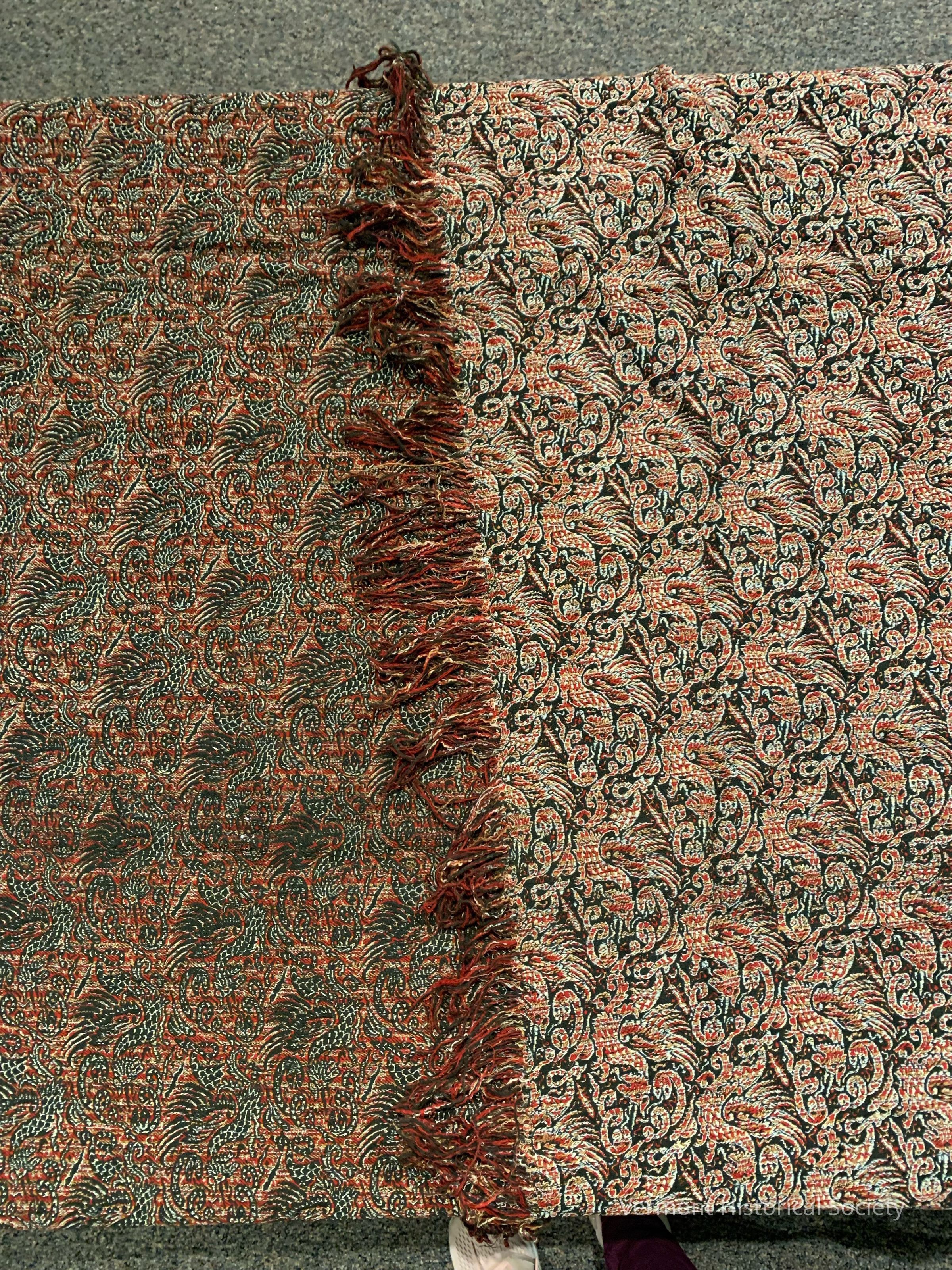 Wool shawl with an abstract woven design in red, black, brown, blue, and yellow. The design resembles a dragon in paisley shapes. There is fringe on all sides.Context