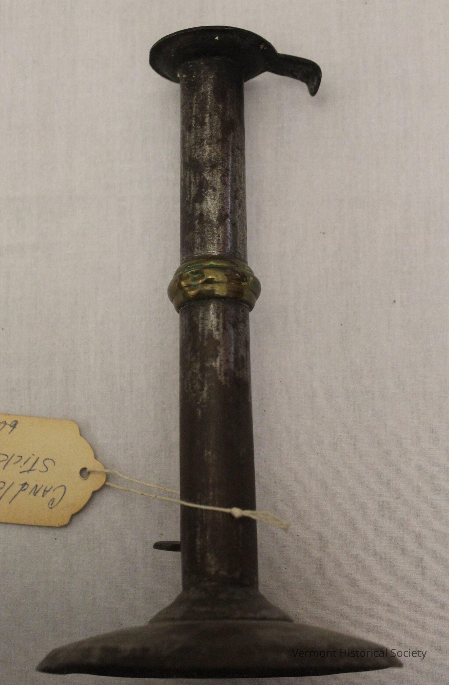 Straight metal candlestick with a round base. There is a tab on the side for raising the candle. There is a decorative brass ring around the candlestick at the top of the height-adjustment slot.