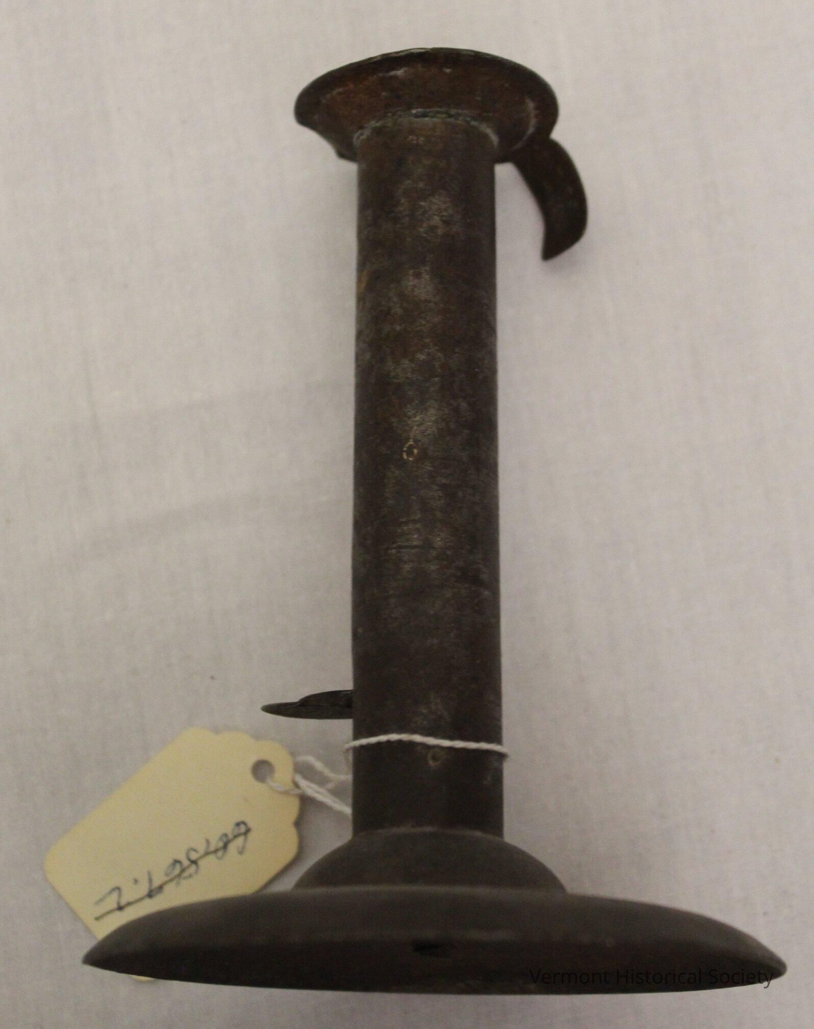 Straight tin candlestick with a round base. There is a tab on the side for raising the candle, and a curled tab at the top for hanging or holding.
