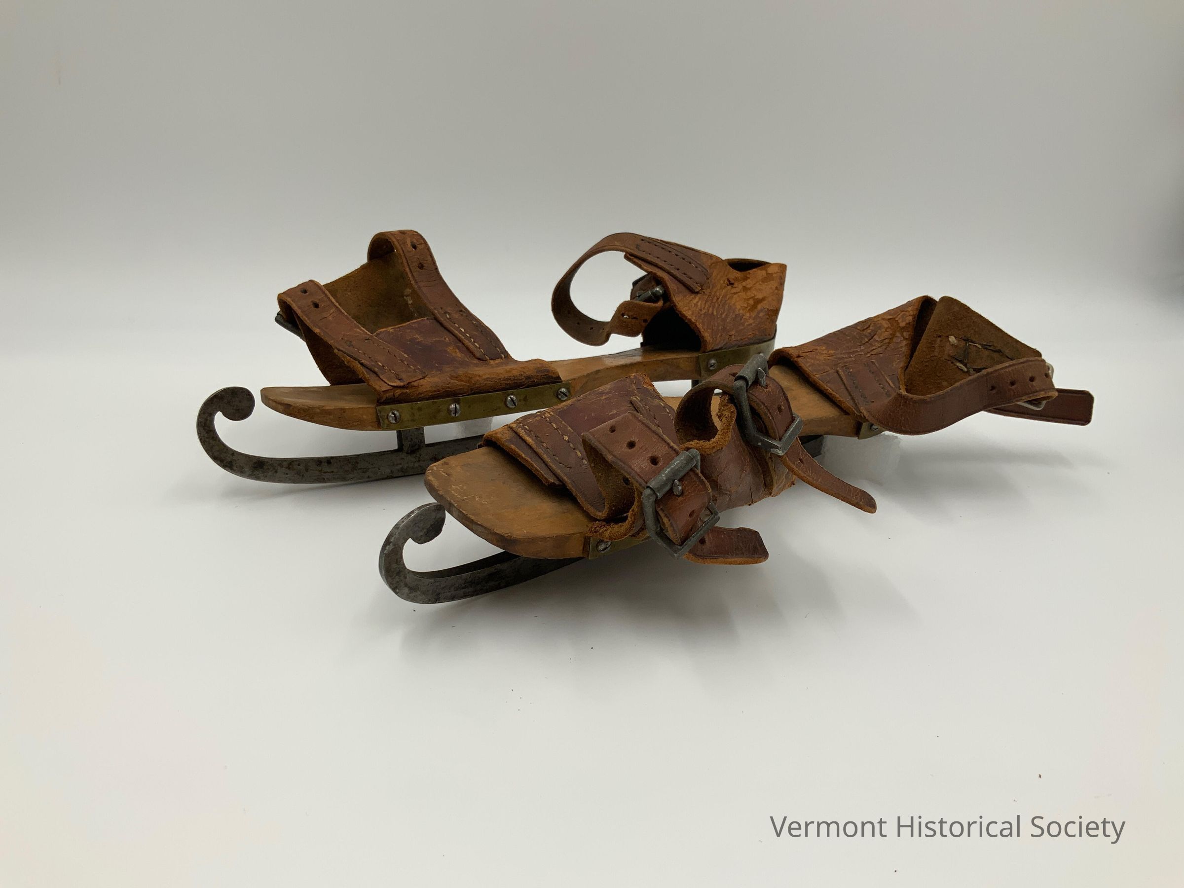 Pair of ice skates. The skates consist of a wooden sole, a metal blade, and leather straps. The sole is shaped like the bottom of a straight-cut shoe with square toes. The straps are attached to the edges of the sole with screws and a strip of metal. The front [toe] straps consist of two wide rectangles on either side with two narrow straps connecting them across the top and securing with metal buckles. The back strap consists of a wide piece of leather that wraps around the back of the heel with a narrow extending strip that crosses in front of the ankle and secures with a metal buckle. The blade spans from the toe to heel and connects to the sole under the ball and heel. The front of the blade extends past the toe and curls upward to be even in height with the sole.