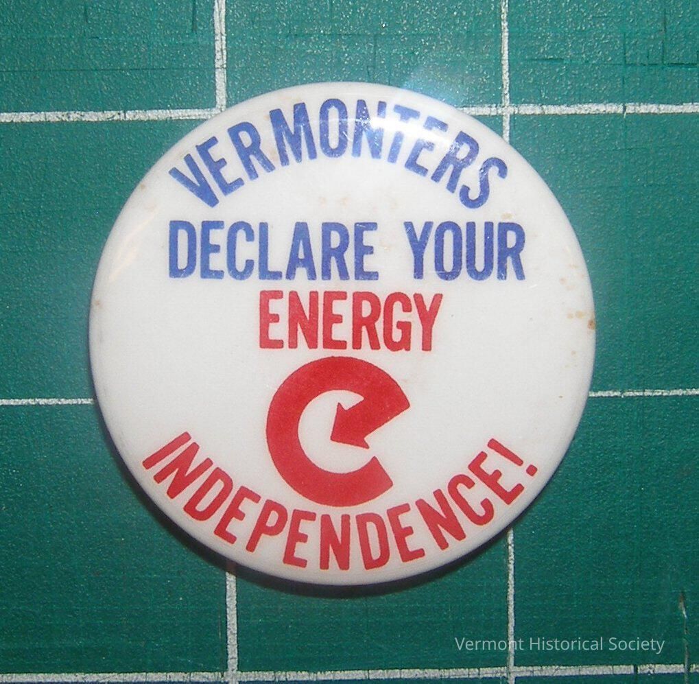 White button with the inscription, "VERMONTERS DECLARE YOUR ENERGY INDEPENDENCE" in blue and red letters. There is a logo for the movement that is a lowercase E with an arrow as the center line.