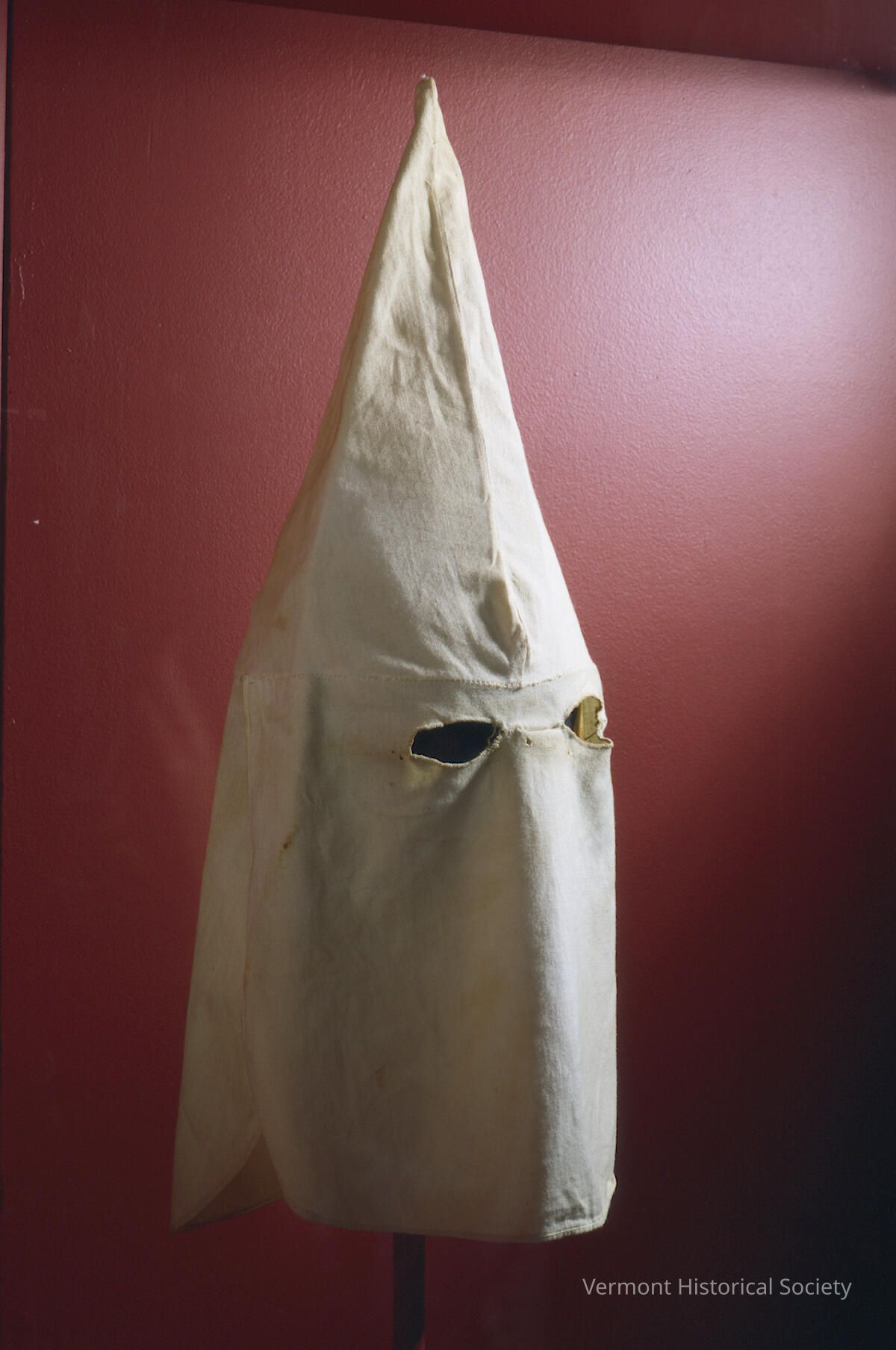 By the time Ku Klux Klan activity took off in Vermont, the national KKK organization had become a money-making corporation. Often, KKK outfits, including the hoods, were either sold or rented by the national organization to local chapters at some profit. The hood displayed here, was machine-made with a specialized backing meant to hold the desired shape.