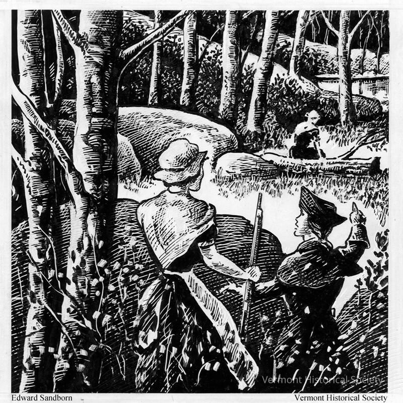 One day the Story boys found a young woman who had been captured by Indians but left behind when she could not keep up. She was pregnant, so the family took her in and Ann served as midwife when the baby was born. This was during the American Revolution, and one morning, a Royalist named Ezekiel Jenny walked by and heard the baby cry. Jenny waited for Story to emerge and confronted her with his musket in the hopes that she would betray her allies, but she would not. After Jenny left, Story sent a message to the Green Mountain Boys which resulted in the capture of a Tory group.