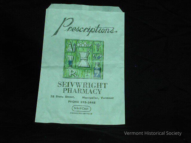 White paper prescription bag. The top of the bag has “Prescriptions” in black cursive print and a graphic of an enclosed green shelving shadow box with blue outlined objects. These white objects with blue outlining include pills, a caduceus, a measuring glass half filled with liquid, a mortar and pestle, the Rx symbol, a scale, and capped bottle. Below this graphic, it reads, “SEIVWRIGHT PHARMACY / 28 State Street, Montpelier, Vermont / PHONE 223-5448” in black print. At the bottom, a black oval encases the words “Select Care,” and has the words “FOR HEALTHCARE VALUE” printed underneath. The back side of the bag, it reads “DID YOU FORGET?/ Convenient One Stop/ Shopping At Your/ Friendly Pharmacy" in black script. Additionally, it provides the information, "1-800-526-9032/ Cardinal Bag/ Mahwah, NJ 07430/ (recycle symbol) Recyclable Package/ M.O. 2-95/ NO. 12."Acquisition