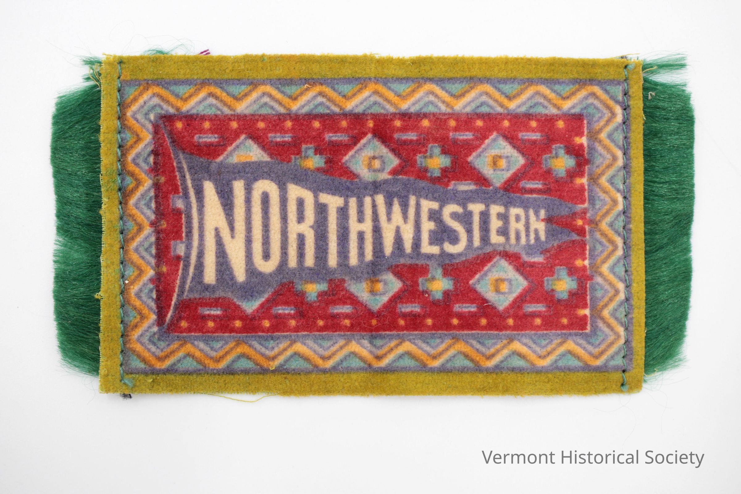Miniature rug sized for a dollhouse. The rug is printed with an eastern design beneath a purple pennant that reads, "NORTHWESTERN". There is green fringe stitched to each short edge of the rug.Context