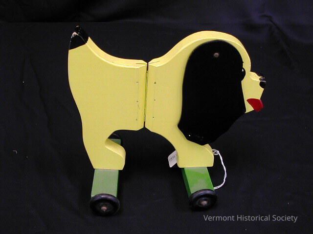 Wooden pull toy in the shape of a stylized dog. The dog is painted yellow with attached felt ears, black tail, nose, and eyes, and a red tongue. It is hinged in the center along a vertical split. The legs rest on green cross bars with black wooden wheels on the ends. There is a metal eye hook at the center front of the front cross bar.Context