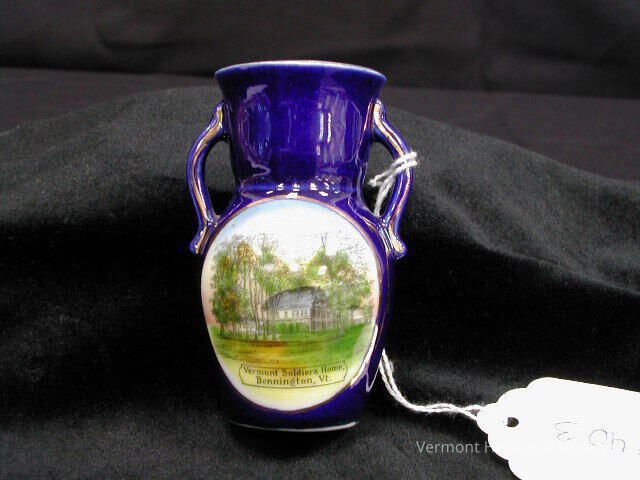 Miniature vase with a full-color illustration of a white house set among tall, green trees. The illustration is labeled, "Vermont Soldier's Home, Bennington, Vt." The rest of the vase is blue with gilded accents. The bottom is labeled, "Made in GERMANY".