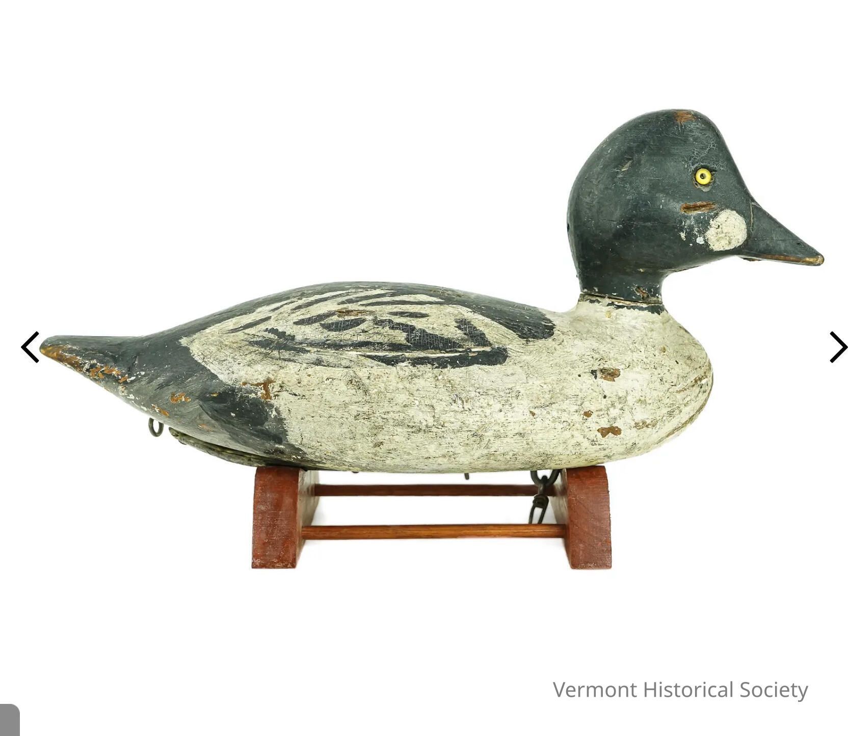 Black-and-white hand-painted duck decoy with yellow glass eyes. The bottom is signed “A. G. Fournier” in black paint. The decoy is missing its left eye and the head is loosely connected to the body of the decoy. The decoy is displayed on a wooden stand with two side pieces connected by two thin rods. The two side pieces have a curved divot in the middle in order for the decoy to rest properly.