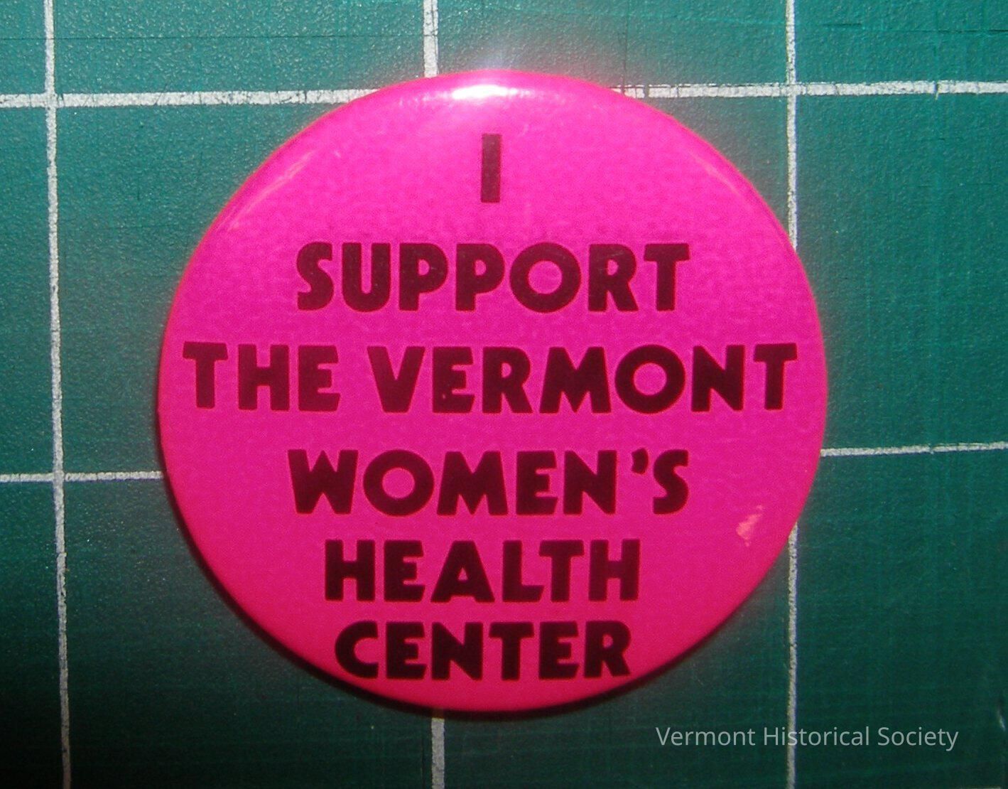 Round pink metal button with the black inscription, "I SUPPORT THE VERMONT WOMEN'S HEALTH CENTER.