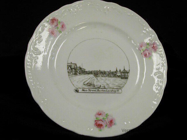 White saucer with an engraved illustration of a village center. The illustration shows a road with several buildings on one side and a park with a gazebo on the other. The image is labeled, "Main Street, Barton Landing, Vt." The rim of the saucer is molded with a feather edge, and there are three groupings of pink cabbage roses spaced evenly around. The bottom is labeled, "Wheelock - Made in Germany for Whipple, French and Co., Barton Landing, VT."Context