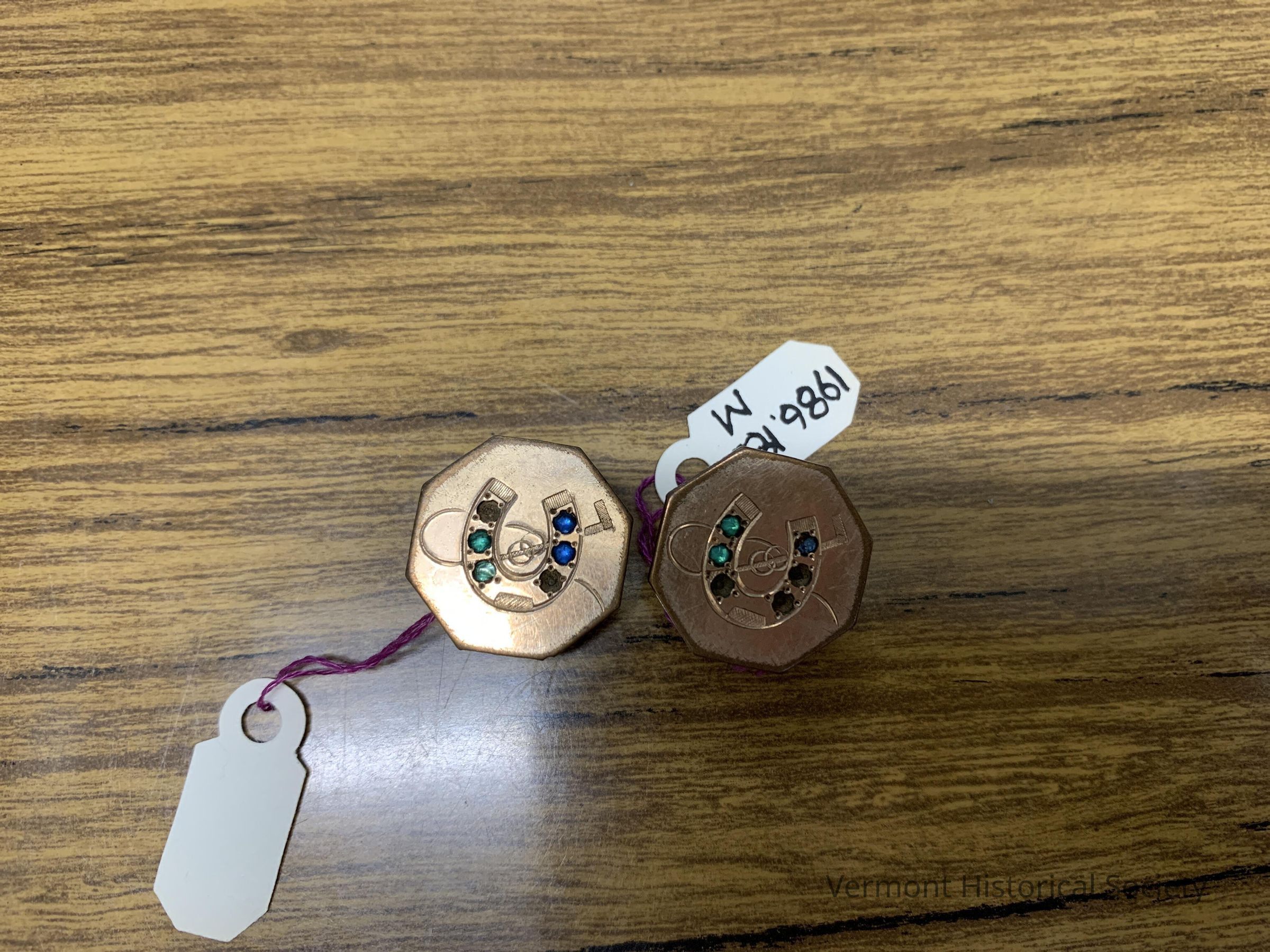 Brass cufflinks engrave with a horseshoe and polo stick. There are 6 blue and green gems inside the horseshoe.