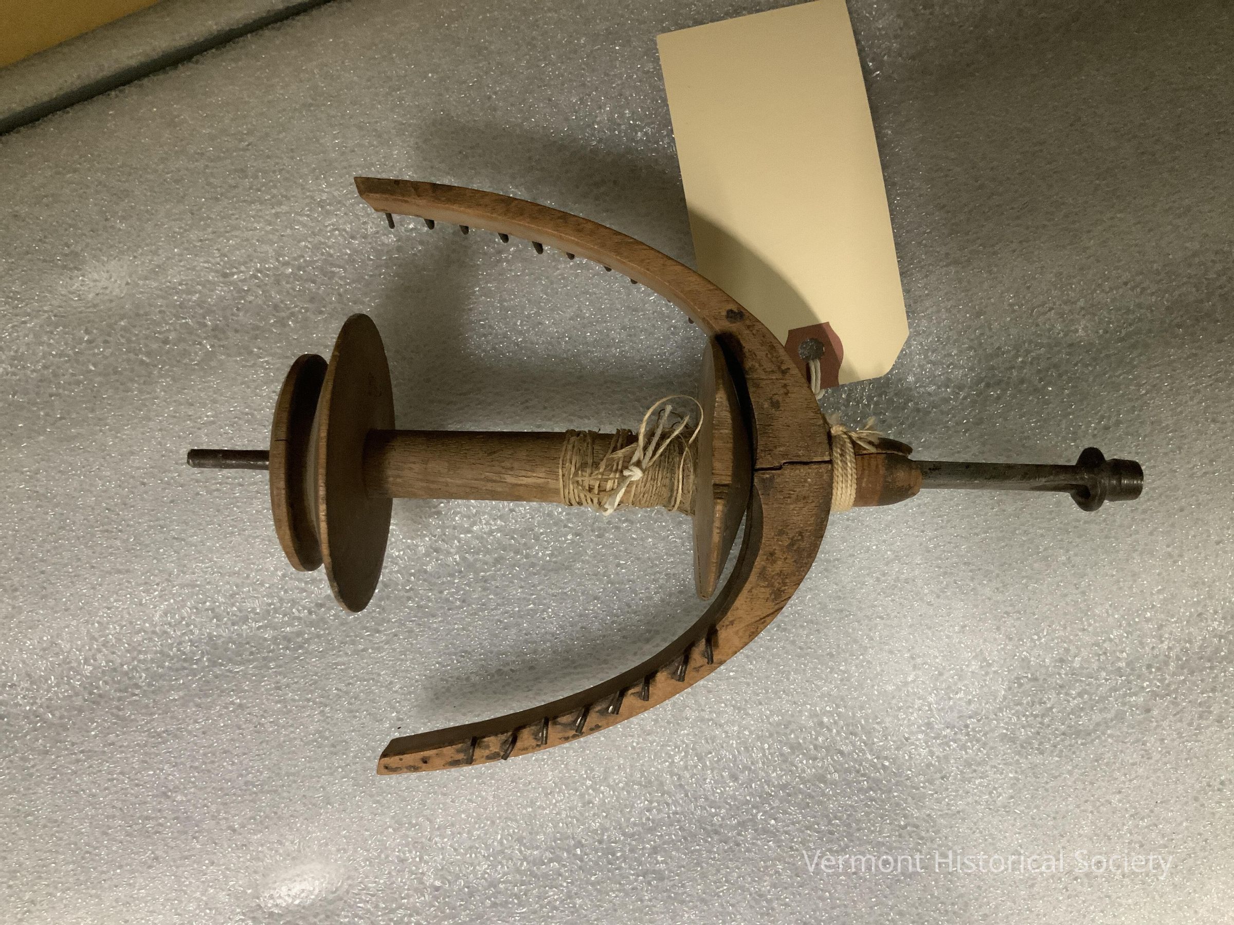 Wooden bobbin from a spinning wheel. The body of the bobbin is a piece of straight metal, with a wooden outside spanning most of the length, and leaving the ends of the metal exposed. Attached near the base of the wood are two wooden circles, both chipped. A third circle is further up on the handle, and above it is an arch shape formed by two pieces of joined wood. The arch has several metal hooks attached to either side. The body of the bobbin has a two lengths of linen thread wrapped around it, one in the middle, and one above the section where the arch is joined.