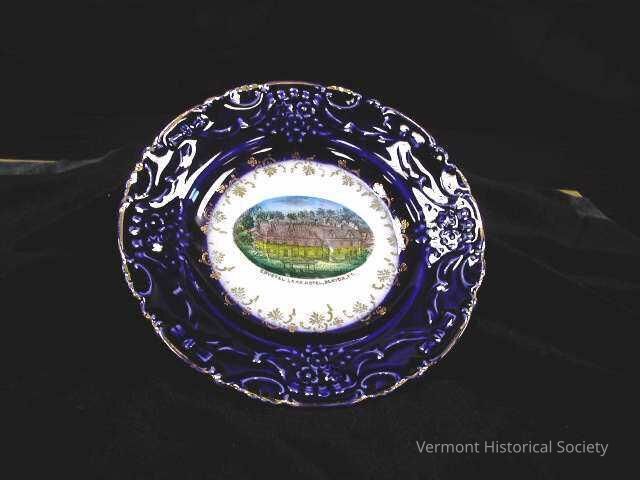Saucer with a colored illustration of a large building painted red and yellow. The image is labeled, "Crystal Lake Hotel, Barton, Vt." The border of the saucer is painted blue (underglaze) and molded with flowers and swirls. A ring of floral gilding separates the blue border and the white center. The bottom is labeled, "Made in Germany for C.P. Jenness, Barton, Vt."Context