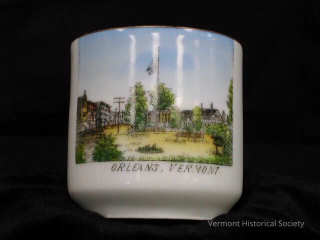 Straight-sided demitasse cup with a full-color illustration of a park in a town center. The park has yellow grass and a bandstand. At the left of the image is a road lined on the opposite side with buildings, and houses sit behind the back. There is an electrical pole, and a flag flies on another pole above the whole scene. The image is labeled, "ORLEANS, VERMONT".