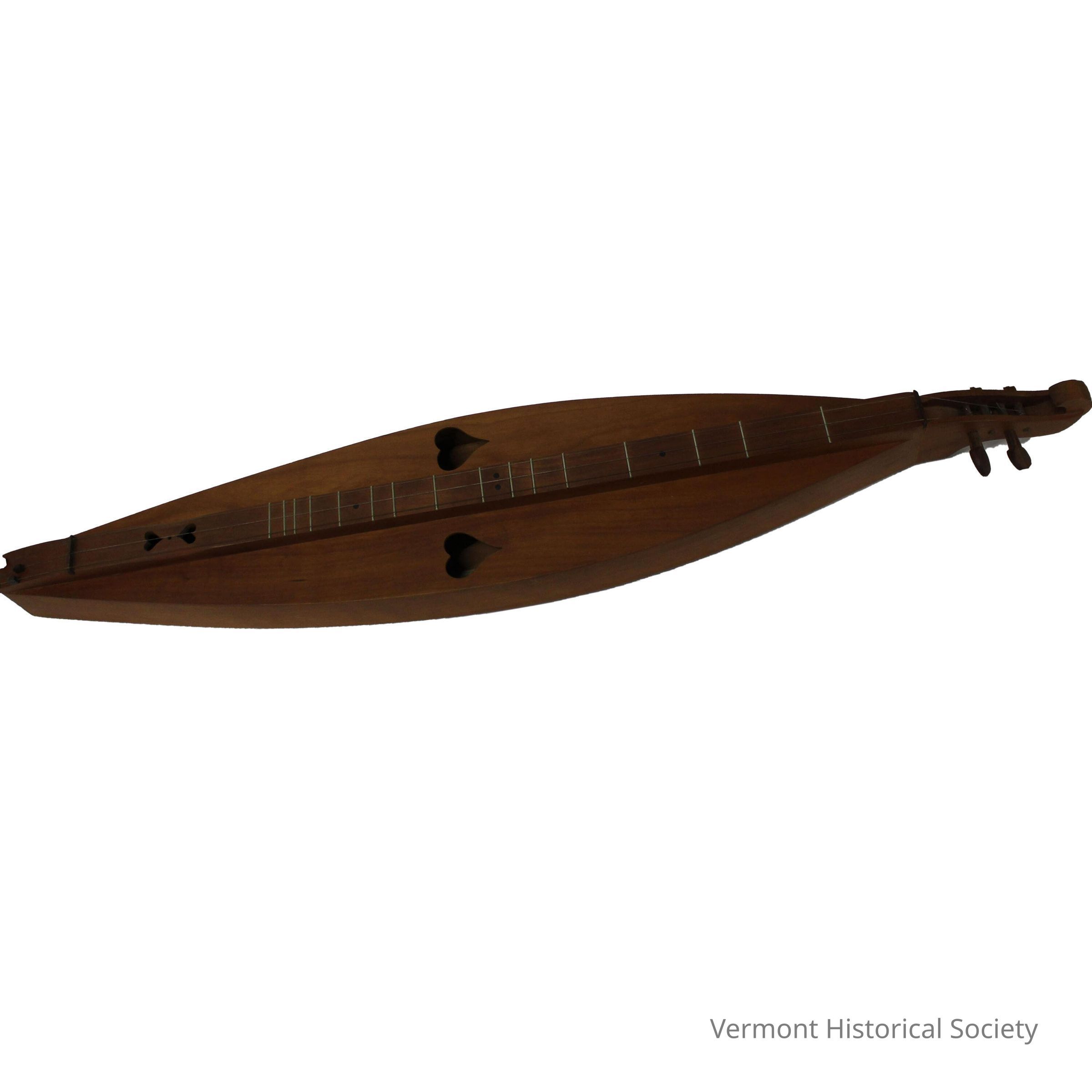 Wooden Appalachian dulcimer with three strings and heart-shaped cutouts. There are four tuning pegs, one with the remnants of a missing string. A small sticker inside gives the maker's information written in blue ink.