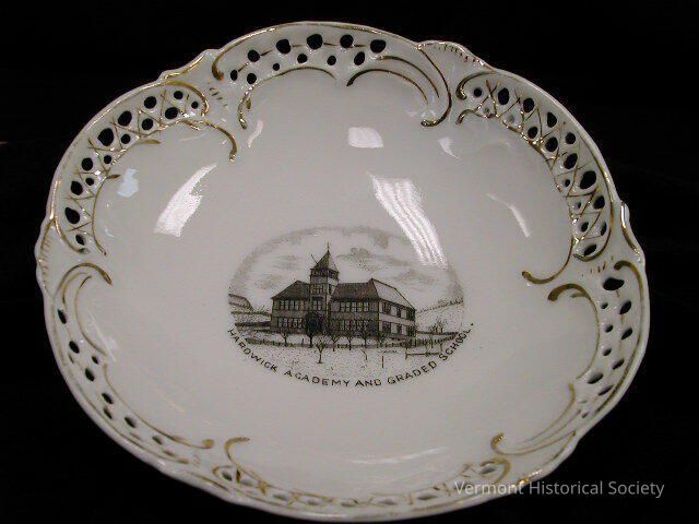 White candy dish with a pierced, basket-like rim decorated with gilding. The center of the dish is decorated with an engraved illustration of a large building with a square central cupola or bell tower. The building sits in a field with short, dead trees. The image is labeled, "HARDWICK ACADEMY AND GRADED SCHOOL." The bottom has a mark that reads, "Made in Germany for W.E. Clement, Hardwick, Vt."Context