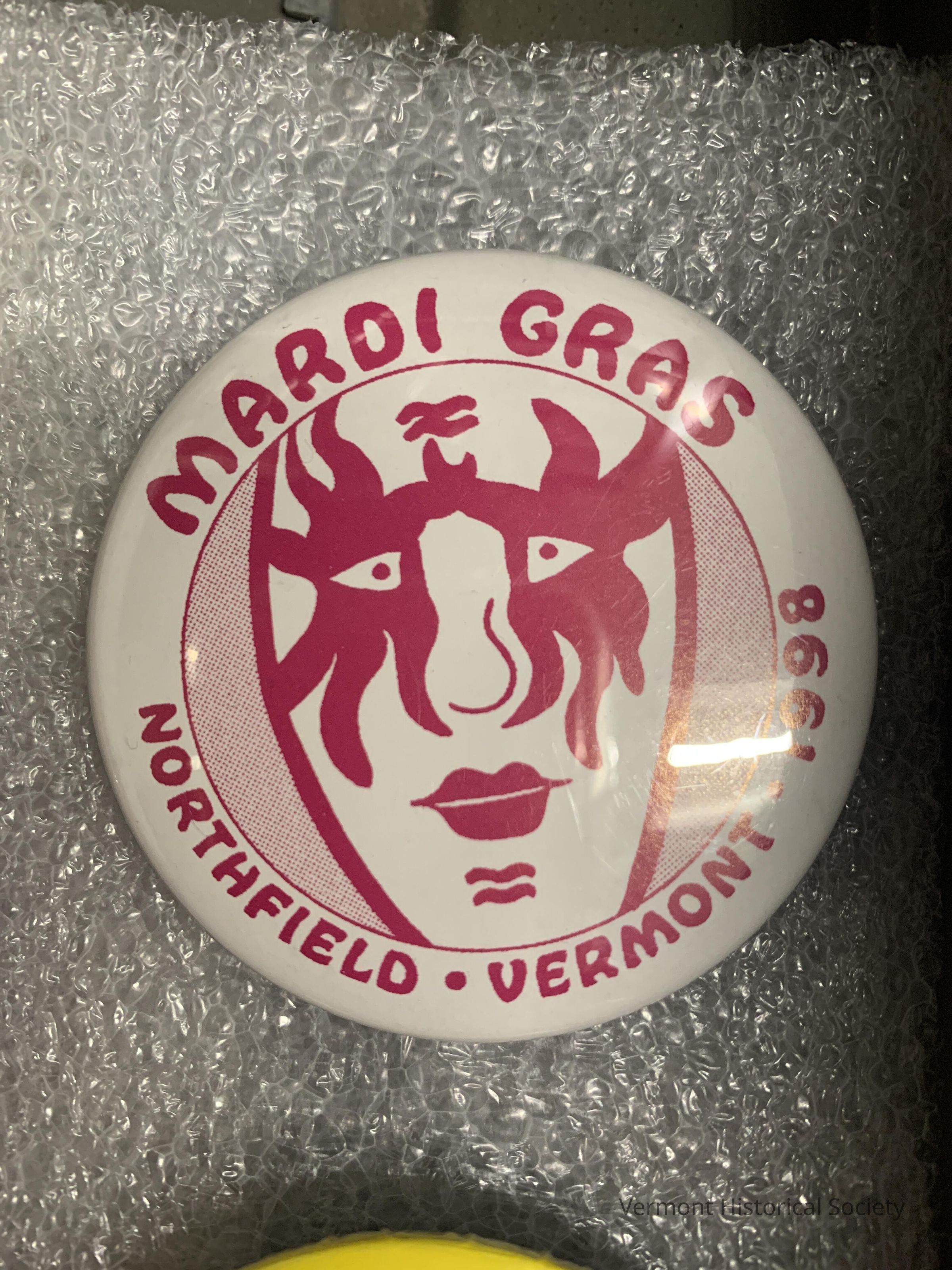 The tag attached to this button says Northfield Observances Inc. which is the organization that run the town's annual Labor Day weekend parade/festival. No information could be found tying that organization to a Mardi Gras event now (2021) or in the past.Acquisition