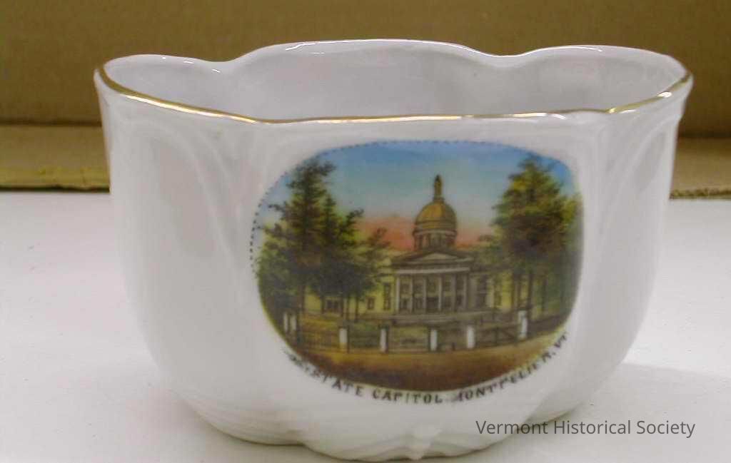 Small white ceramic nut dish with a colored illustration of a government building with a golden dome in the center. The building has a portico with six columns and is flanked by trees. The illustration is labeled, "STATE CAPITOL MONTPELIER, VT". The bottom bears the mark, "Hand Painted The Jonroth Studios Germany / Painted and imported for Buswell's Book Store, Montpelier, Vt."