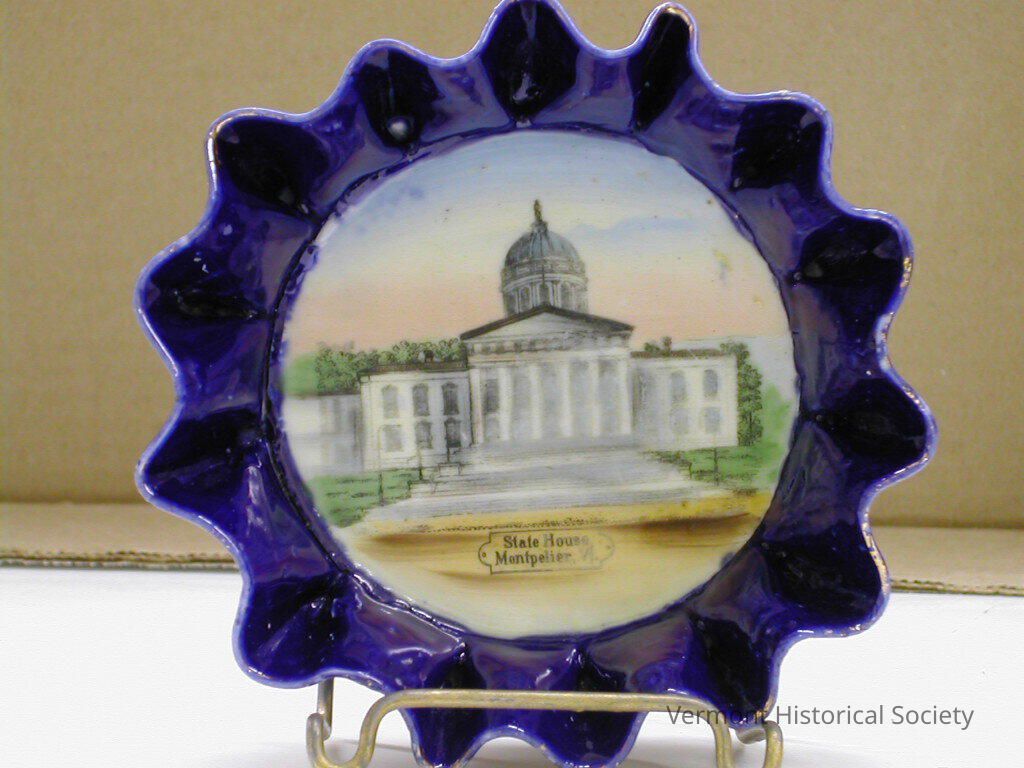 Blue ashtray with fluted sides. There is an illustration at the center of a neoclassical building with a silver dome at the center. The building has a portico with six columns. The illustration is labeled, "State House Montpelier, Vt." Outside of the fully color illustration, the rest of the dish is blue. The reverse bears the mark, "Made in Germany for Miss S. S. Slade Montpelier, Vt."Context