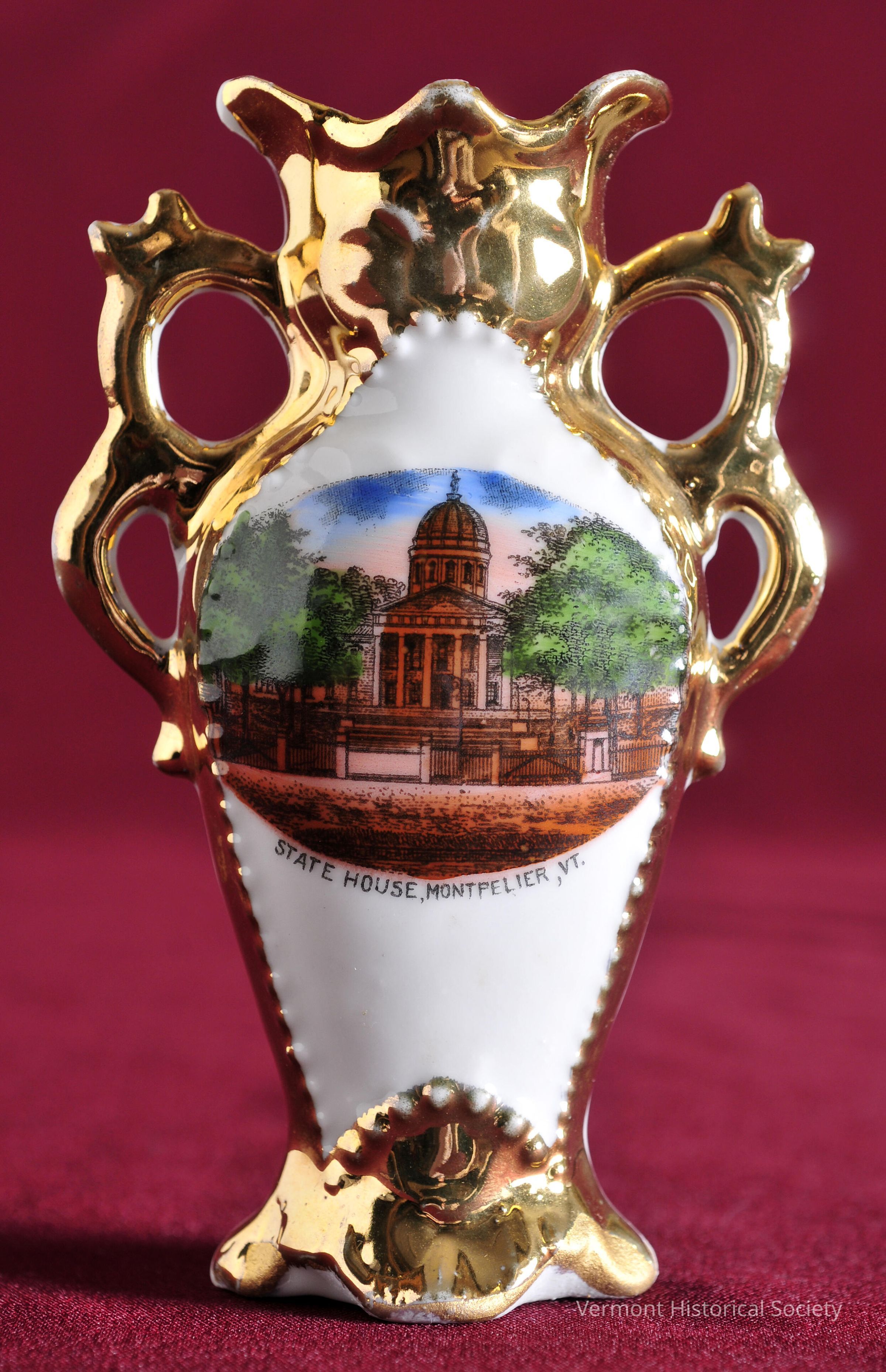 Miniature vase with two double handles. The vase has an illustration of a neoclassical building with a domed cupola and a six-columned portico. It is partially colored and has the label, "STATE HOUSE MONTPELIER, VT". The res of the vase is lustered gold. The bottom bears the mark, "MADE IN GERMANY FOR Boston Bargain Store Montpelier, Vt."