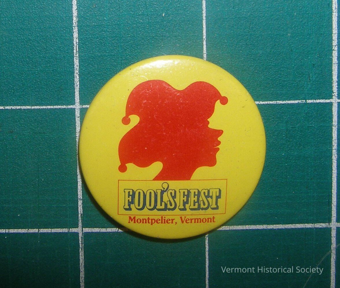 Yellow button with a red silhouette of a person in a jester hat with three points. The inscription, "Fool's Fest", is within a rectangle, and the words "Montpelier, Vermont" are beneath it.Context