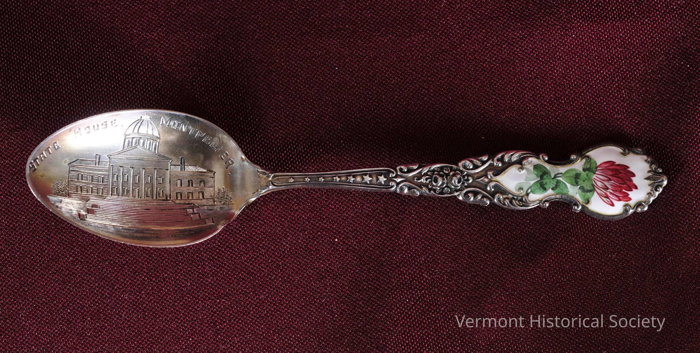 Small decorative spoon. The bowl is engraved with the image of a neoclassical building with a domed cupola and a six-columned portico. The image is labeled, "STATE HOUSE MONTPELIER". The handle is ornately molded, and the end is enameled with the painted image of a clover flower and leaves.
