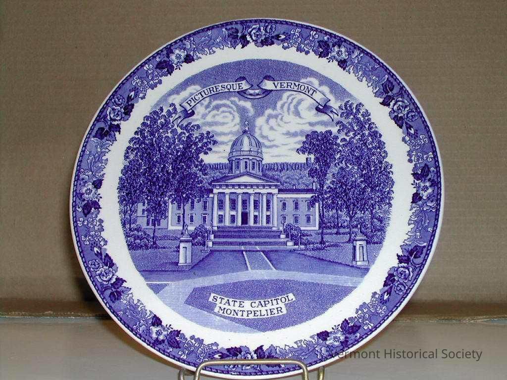 Transferware plate printed with the image of a neoclassical building with a domed cupola and the label, "PICTURESQUE VERMONT / STATE CAPITOL MONTPELIER". The border is printed with a repeating design of flowers. The reverse has a label that says, "Old English StaffordhshireWare / JONROTH / ENGLAND/ MADE IN STAFFORDSHIRE ENGLAND/ BY THE BEDFORD POTTERIES/ ESTABLISHED IN 1792/ IMPORTED EXCLUSIVELY/ FOR/ PAUL C. HARRINGTON, / MONTPELIER, VT."Context