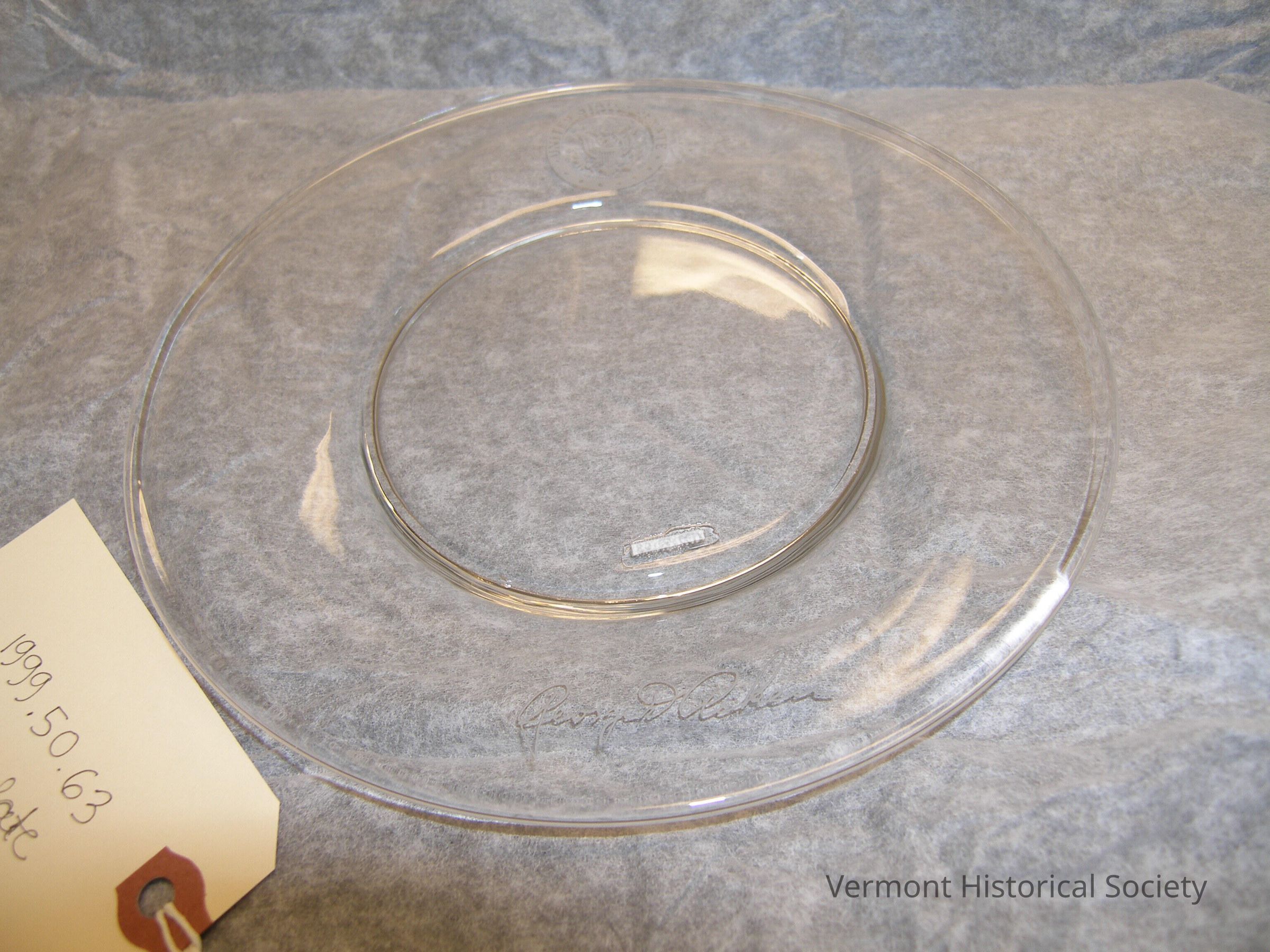 Clear glass plate with a wide border. The US Senate seal is engraved at the top of the border, and the signature of George D. Aiken is engraved at the bottom of the border.