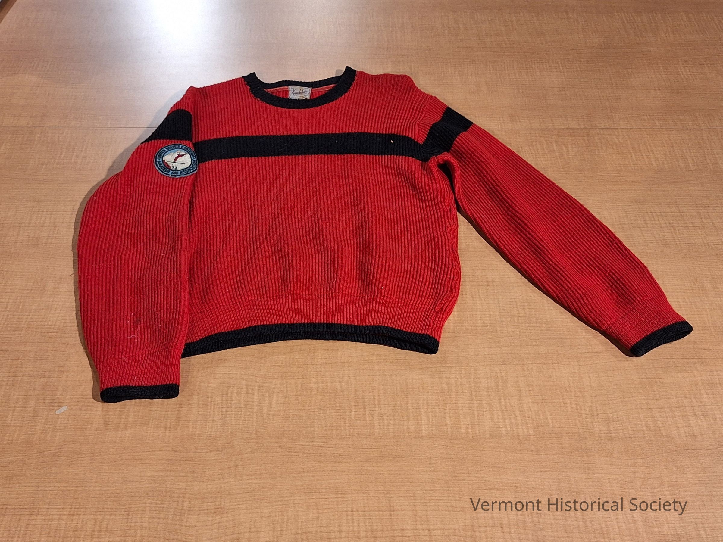 Red and black knit wool sweater. The crew neck sweater is red with a ribbed stitch pattern. The collar, cuffs, and waist have a short black border and there is a thicker black stripe across the chest and sleeves. The sweater has a patch sewn onto the right arm just below the black stripe that is blue with a ski jumper in a red snowsuit. Around the image are the words "UNITED STATES EASTERN AMATEUR SKI ASSOCIATION" in black lettering.
