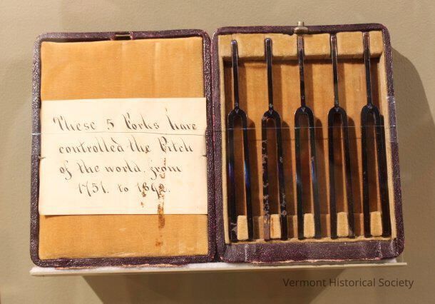 In 1899 former Vermont Governor Levi K. Fuller exhibited his collection of over 300 tuning forks at the Boston branch of the Estey Organ Company. A newspaper clipping reporting on the exhibit was included with this case of tuning forks that Vermont Historical Society purchased in 1999. The exterior of this case is stamped in gold with Fuller's name and inside the cover was the note, "These five forks have/controlled the Pitch/of the world, from/1751 to 1892." Each fork is marked in gold with Fuller's name, a pitch and a composer's name. According to the article, a fork that Fuller owned marked "A422.5 Handel" was used by the composer when he conducted the Messiah in 1751. In 1892 Governor Fuller, the founder and owner of the Estey Organ Company, adopted the international pitch A435. These forks all are stamped "Valantine & Carr/Sheffield England" and were most likely a set Fuller made in the late 1800s. The forks are marked (left to right):