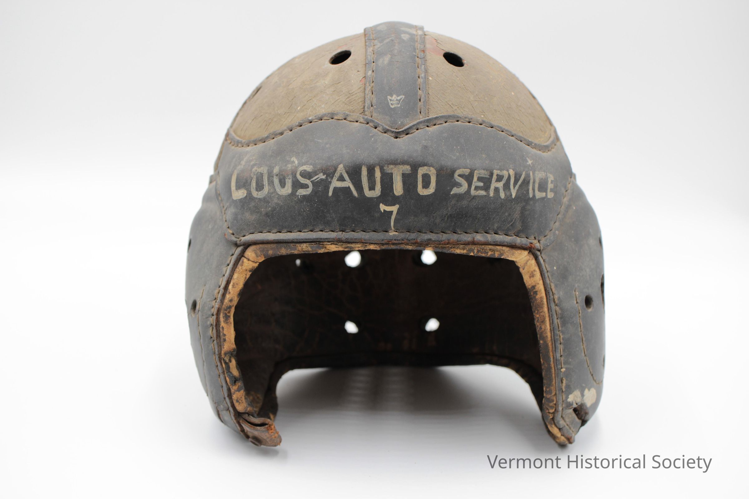 Leather football helmet used by Lou Lyon of Northfield, Vermont, to race at the Dog River Speedway in Northfield, VermontAcquisition