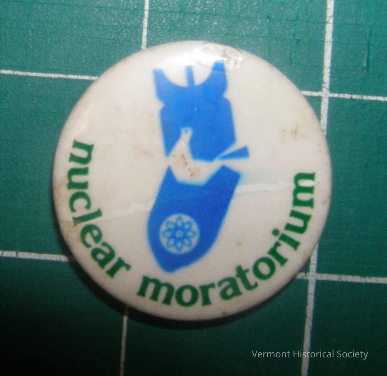 Round white button printed in blue with an image of a bomb broken in half around the shape of a dove with the green words, "nuclear moratorium".