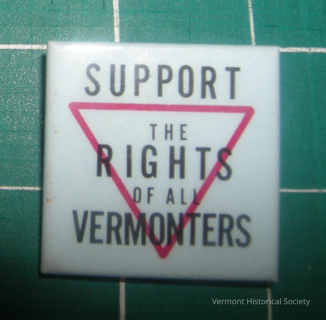 White square metal button with the black inscription, "SUPPORT THE RIGHTS OF ALL VERMONTERS" over a pink triangle.