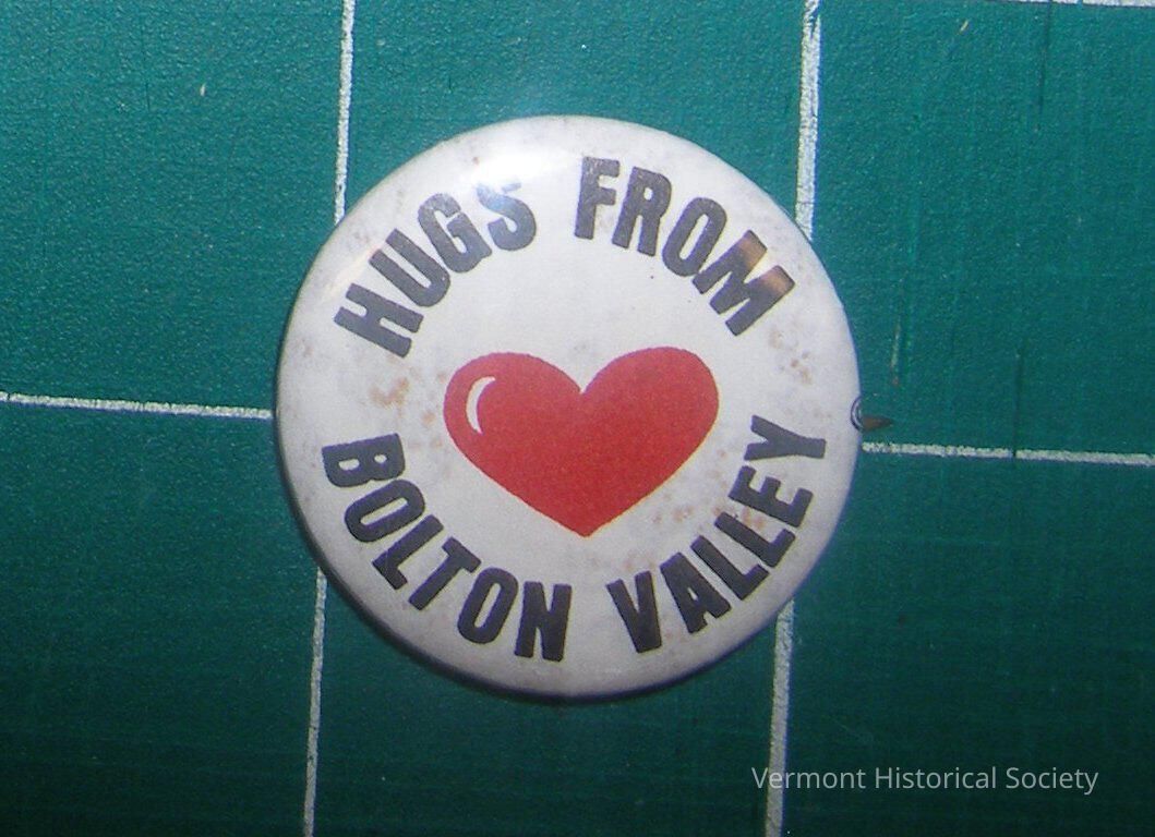 White button with a red heart in center and the black inscription, "HUGS FROM/ BOLTON VALLEY". There is a stationery pin on back.Context