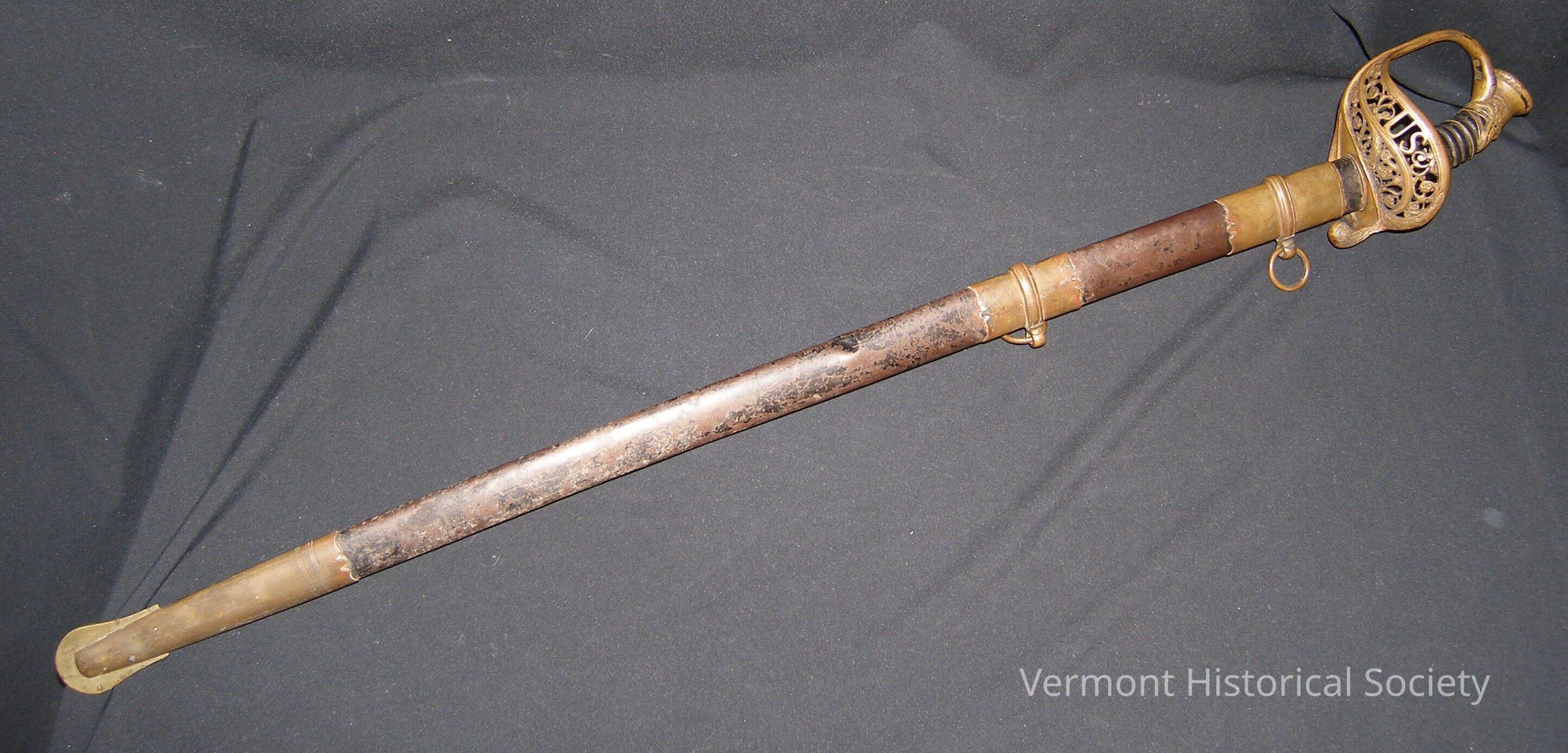 Sword and scabbard. The sword has a leather grip wrapped with twisted gold-toned wire. The guard and pommel are brass, and the rain guard is filigreed into floral vines and the letters US. The blade is lightly etched with a floral design. The scabbard is dark metal with brass hooks and chape.Context