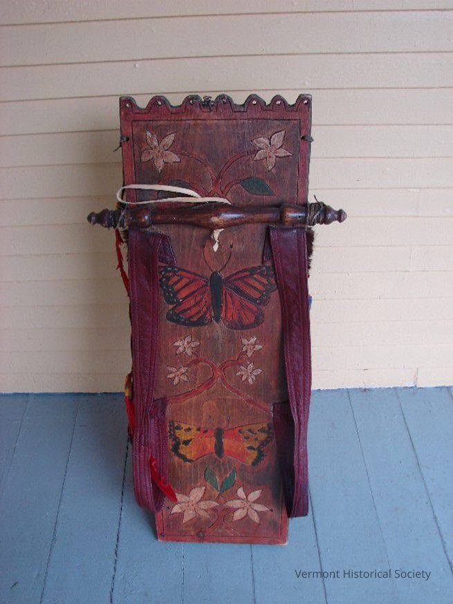Wooden board with attached, turned cross-bar, and leather shoulder straps. Incised and painted decoration or Monarch butterfly and white trillium.