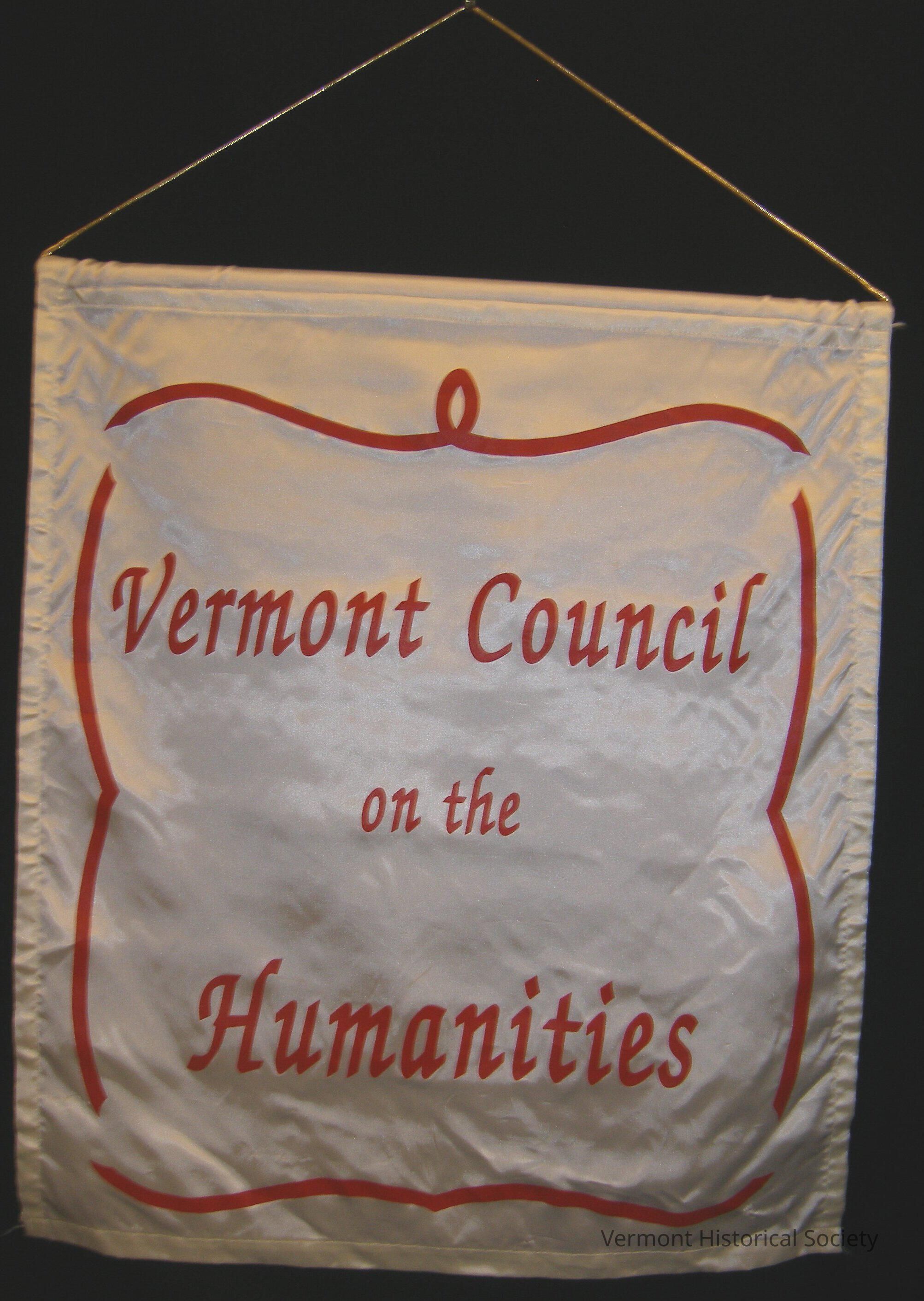 The banner is made of a smooth off-white synthetic fabric with a satin-like sheen. In the center of the banner, there is bold red script that reads "Vermont Council on the Humanities." This text is enclosed within a curving border also in red.