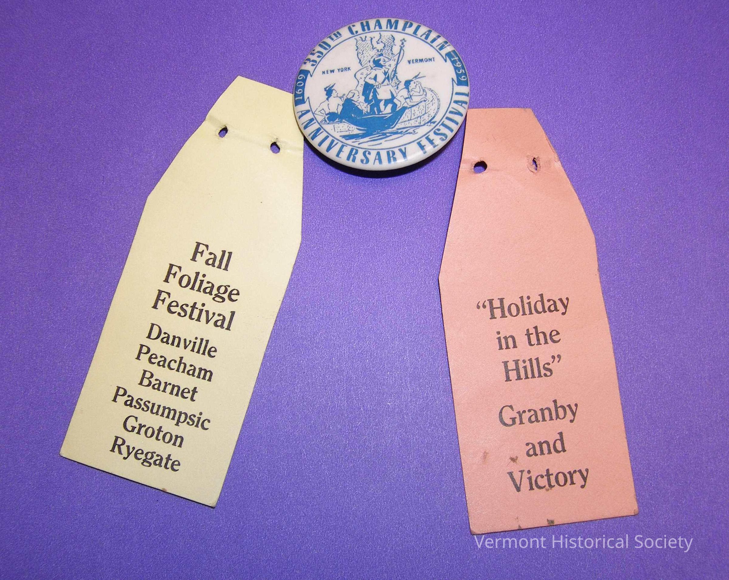 Round white button printed in blue with an image of a man standing in a boat with three seated figures, two dressed as Indigenous Americans and one in European clothing. The inscription, "1609 350th CHAMPLAIN 1959 ANNIVERSARY FESTIVAL" rings the edge. The button is accompanied by two paper "ribbons". One is yellow and reads, "Fall Foliage Festival Danville Peacham Barnet Passumpsic Groton Ryegate". The other is orange and reads, ""Holiday in the Hills" Granby and Victory".Context