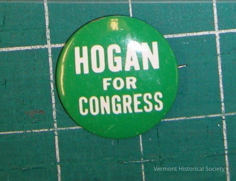 Round green button with the white inscription, "HOGAN FOR CONGRESS".